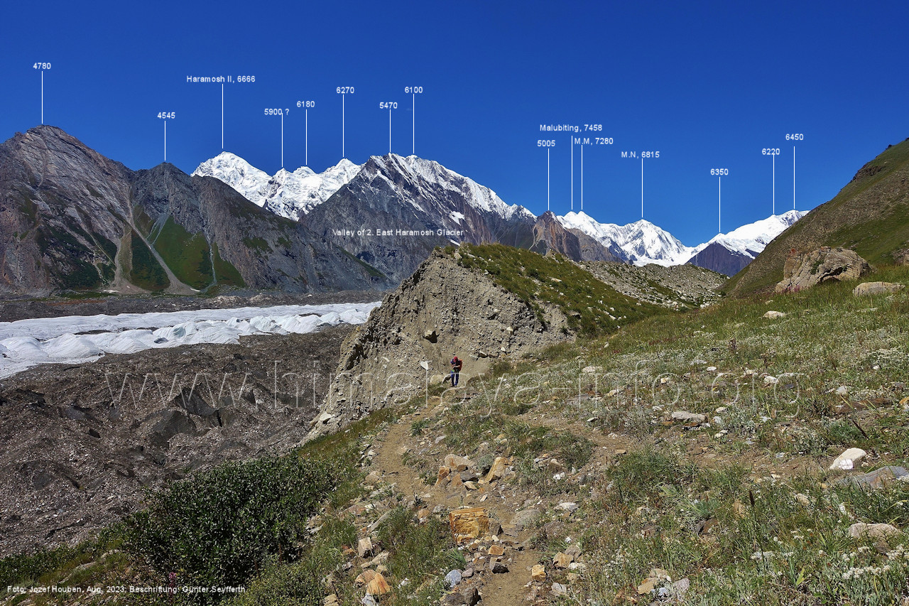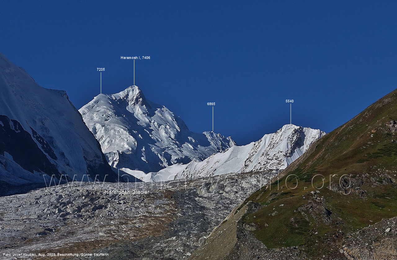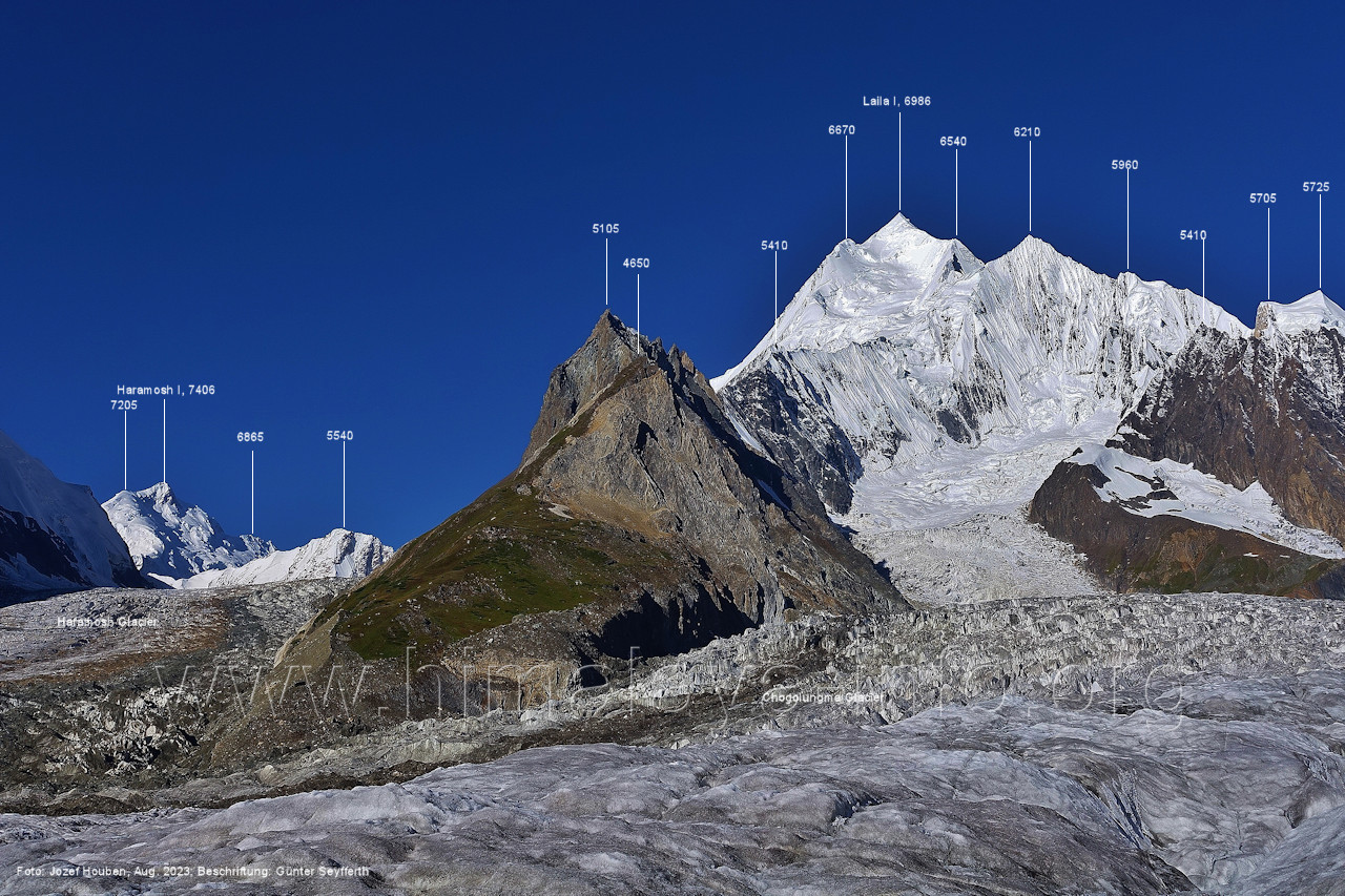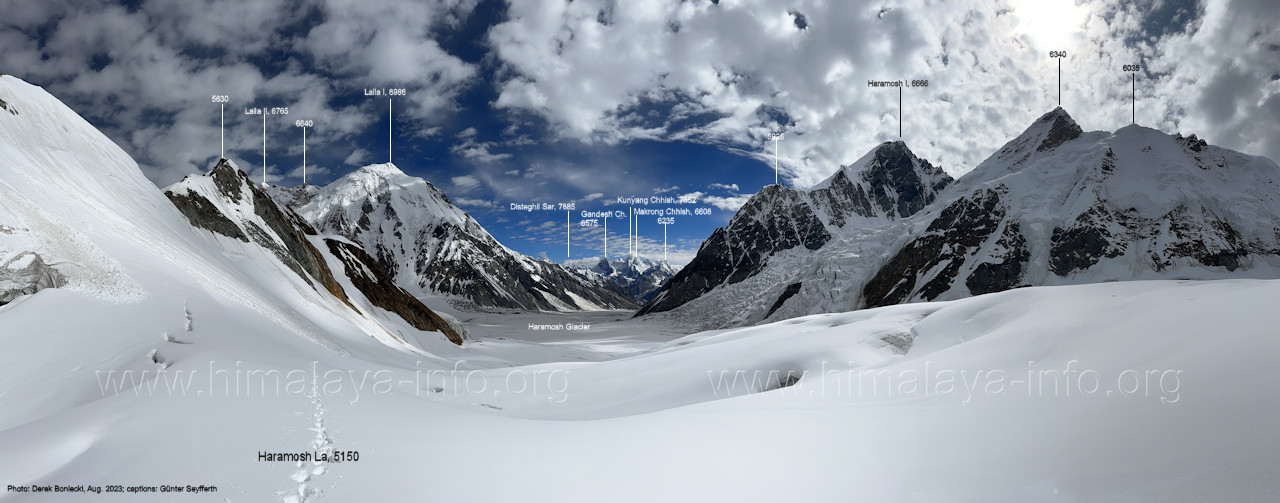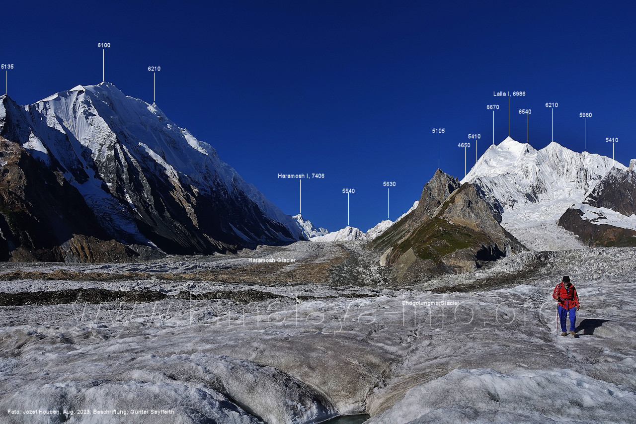 befindet sich der Haramosh La (5150 m). Foto: Jozef Houben, Aug. 2023; Beschriftung: Günter Seyfferth (82) Blick bei 75°03'20" nach Südwesten entlang des Haramosh-Gletschers mit Haramosh I (7406 m) und Laila I (6986 m) Foto: Jozef Houben, Aug. 2023; Beschriftung: Günter Seyfferth (83) Blick bei 75°03'10" nach Südwesten mit Haramosh I (7406 m) und Laila I (6986 m) Der Haramosh La liegt im Bereich des tiefsten Punktes des Grats, der vom Peak 5540 nach links abfällt. Foto: Jozef Houben, Aug. 2023; Beschriftung: Günter Seyfferth (84) Tele-Blick bei 75°03'05" nach Südwesten zum Haramosh I (7406 m) Foto: Jozef Houben, Aug. 2023; Beschriftung: Günter Seyfferth (84a) Blick bei 75°02'50" in der Mitte des Gletschers in ca. 4100 m Höhe nach Südwesten zur Laila I (6986 m) Beim Aufstieg ging die Gruppe von Jozef Houben in der