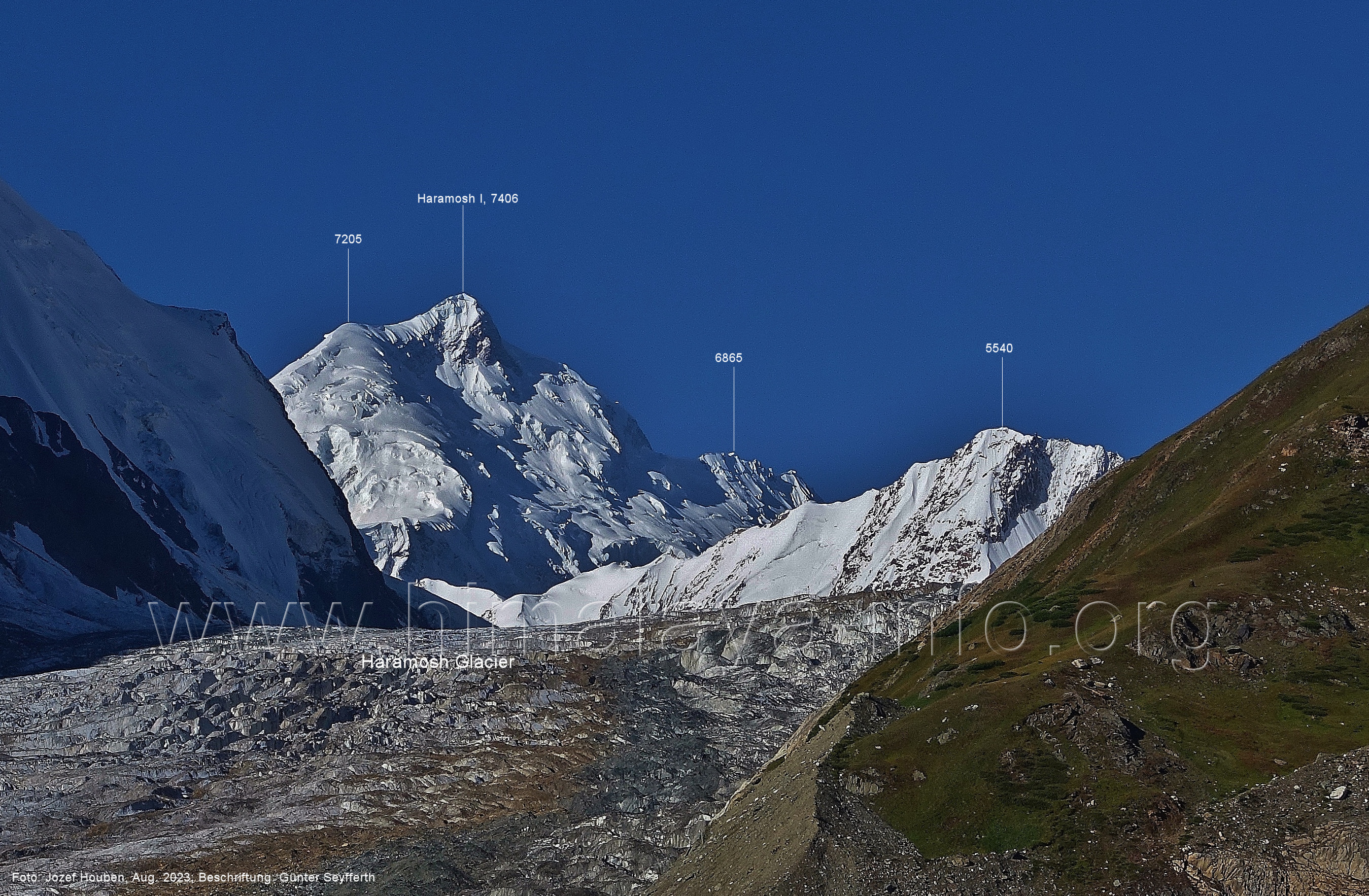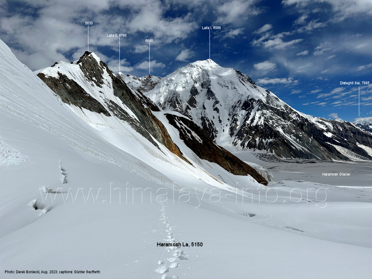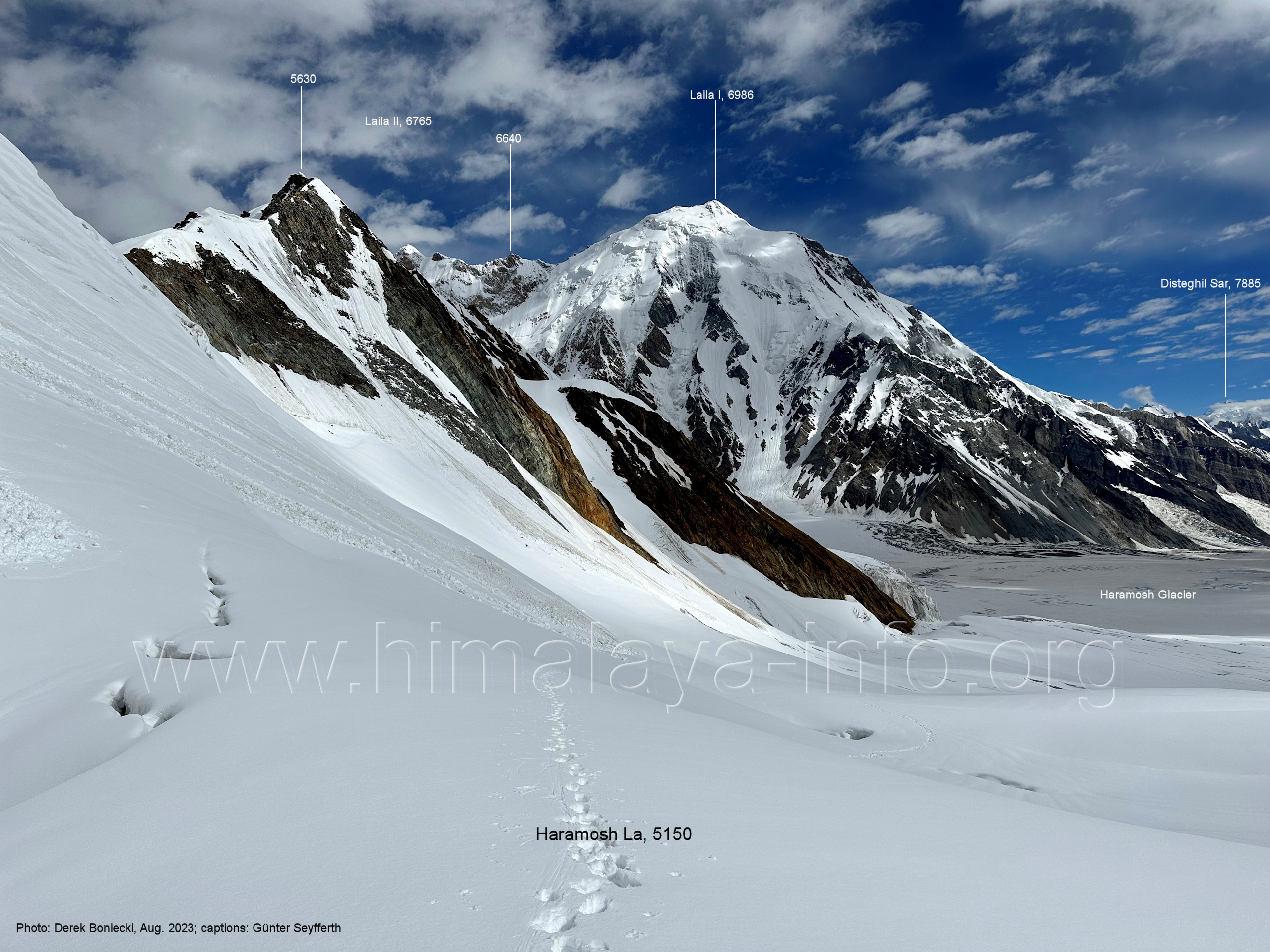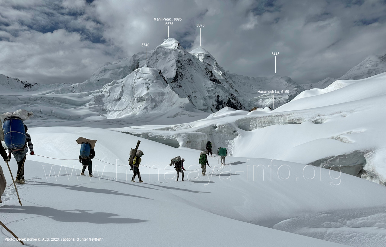 befindet sich der Haramosh La (5150 m). Foto: Jozef Houben, Aug. 2023; Beschriftung: Günter Seyfferth (82) Blick bei 75°03'20" nach Südwesten entlang des Haramosh-Gletschers mit Haramosh I (7406 m) und Laila I (6986 m) Foto: Jozef Houben, Aug. 2023; Beschriftung: Günter Seyfferth (83) Blick bei 75°03'10" nach Südwesten mit Haramosh I (7406 m) und Laila I (6986 m) Der Haramosh La liegt im Bereich des tiefsten Punktes des Grats, der vom Peak 5540 nach links abfällt. Foto: Jozef Houben, Aug. 2023; Beschriftung: Günter Seyfferth (84) Tele-Blick bei 75°03'05" nach Südwesten zum Haramosh I (7406 m) Foto: Jozef Houben, Aug. 2023; Beschriftung: Günter Seyfferth (84a) Blick bei 75°02'50" in der Mitte des Gletschers in ca. 4100 m Höhe nach Südwesten zur Laila I (6986 m) Beim Aufstieg ging die Gruppe von Jozef Houben in der