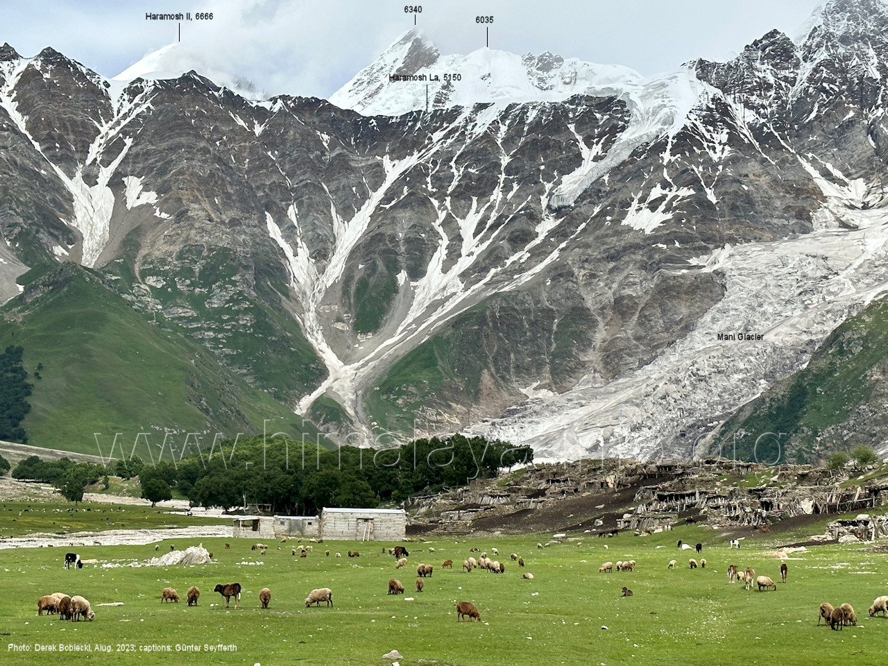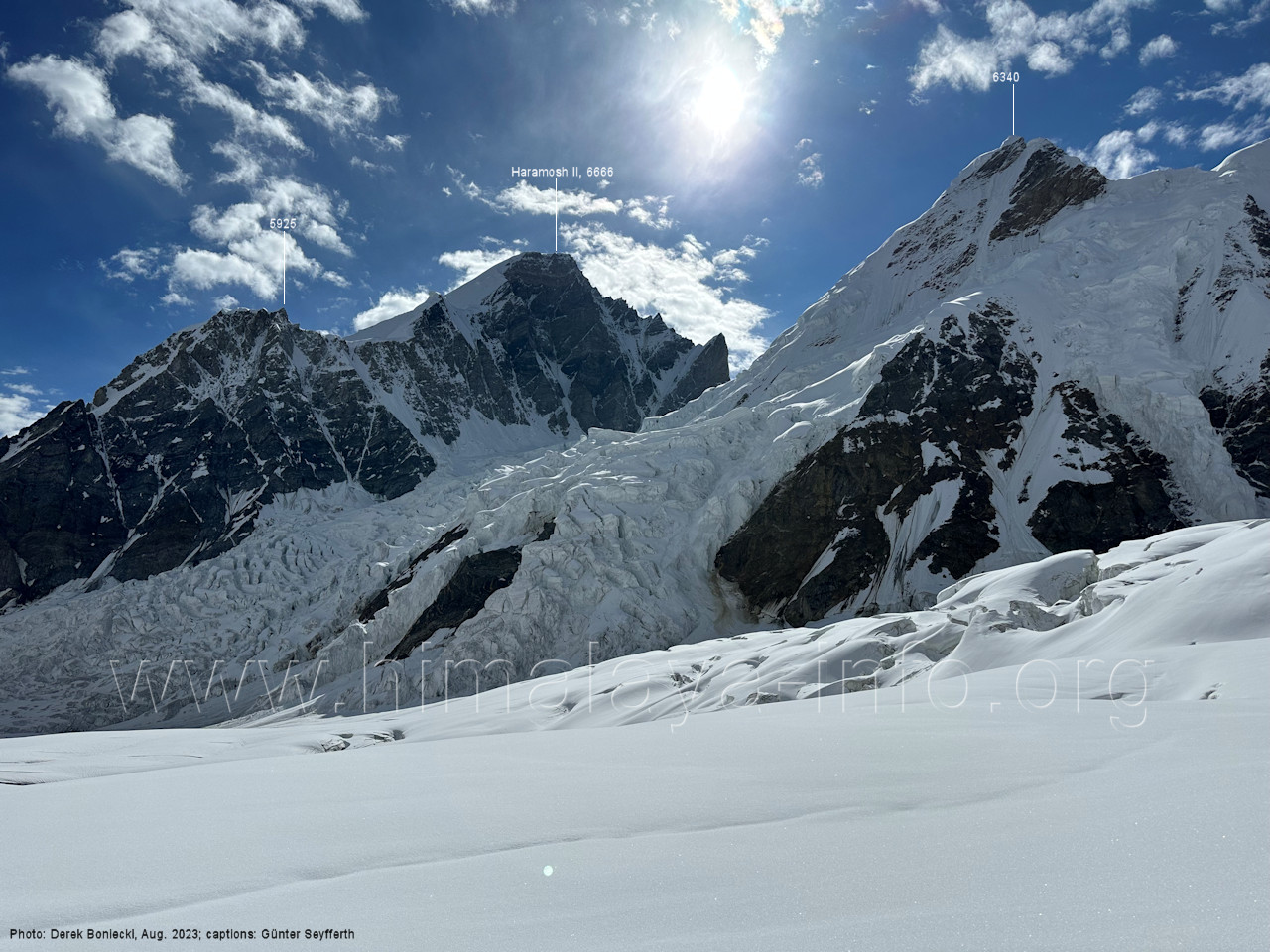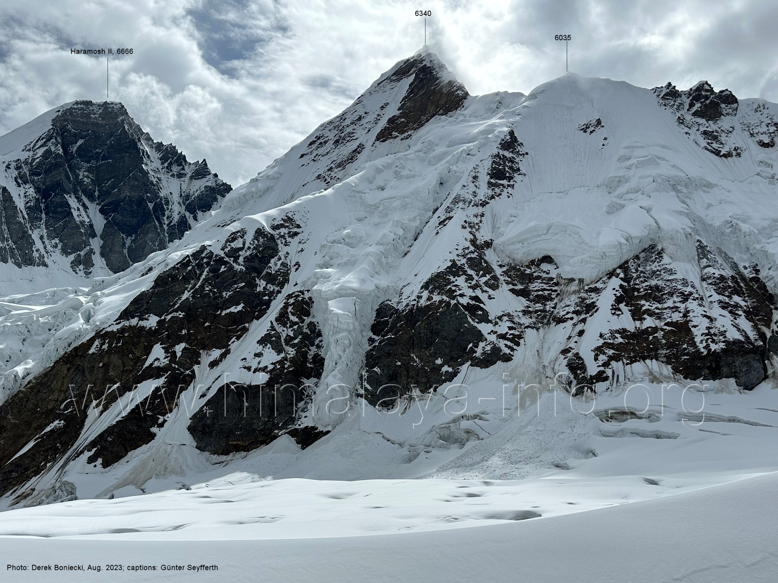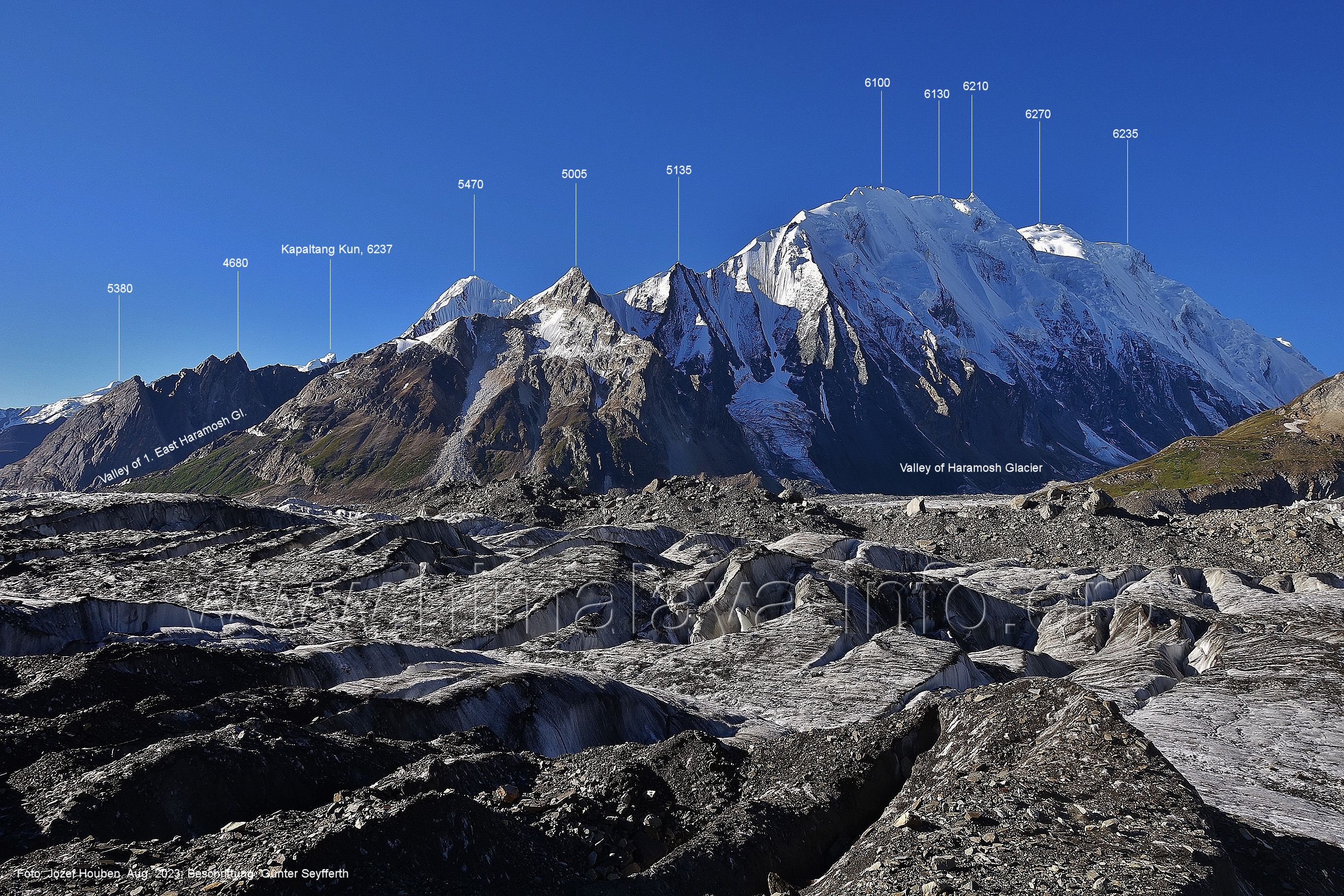 befindet sich der Haramosh La (5150 m). Foto: Jozef Houben, Aug. 2023; Beschriftung: Günter Seyfferth (82) Blick bei 75°03'20" nach Südwesten entlang des Haramosh-Gletschers mit Haramosh I (7406 m) und Laila I (6986 m) Foto: Jozef Houben, Aug. 2023; Beschriftung: Günter Seyfferth (83) Blick bei 75°03'10" nach Südwesten mit Haramosh I (7406 m) und Laila I (6986 m) Der Haramosh La liegt im Bereich des tiefsten Punktes des Grats, der vom Peak 5540 nach links abfällt. Foto: Jozef Houben, Aug. 2023; Beschriftung: Günter Seyfferth (84) Tele-Blick bei 75°03'05" nach Südwesten zum Haramosh I (7406 m) Foto: Jozef Houben, Aug. 2023; Beschriftung: Günter Seyfferth (84a) Blick bei 75°02'50" in der Mitte des Gletschers in ca. 4100 m Höhe nach Südwesten zur Laila I (6986 m) Beim Aufstieg ging die Gruppe von Jozef Houben in der