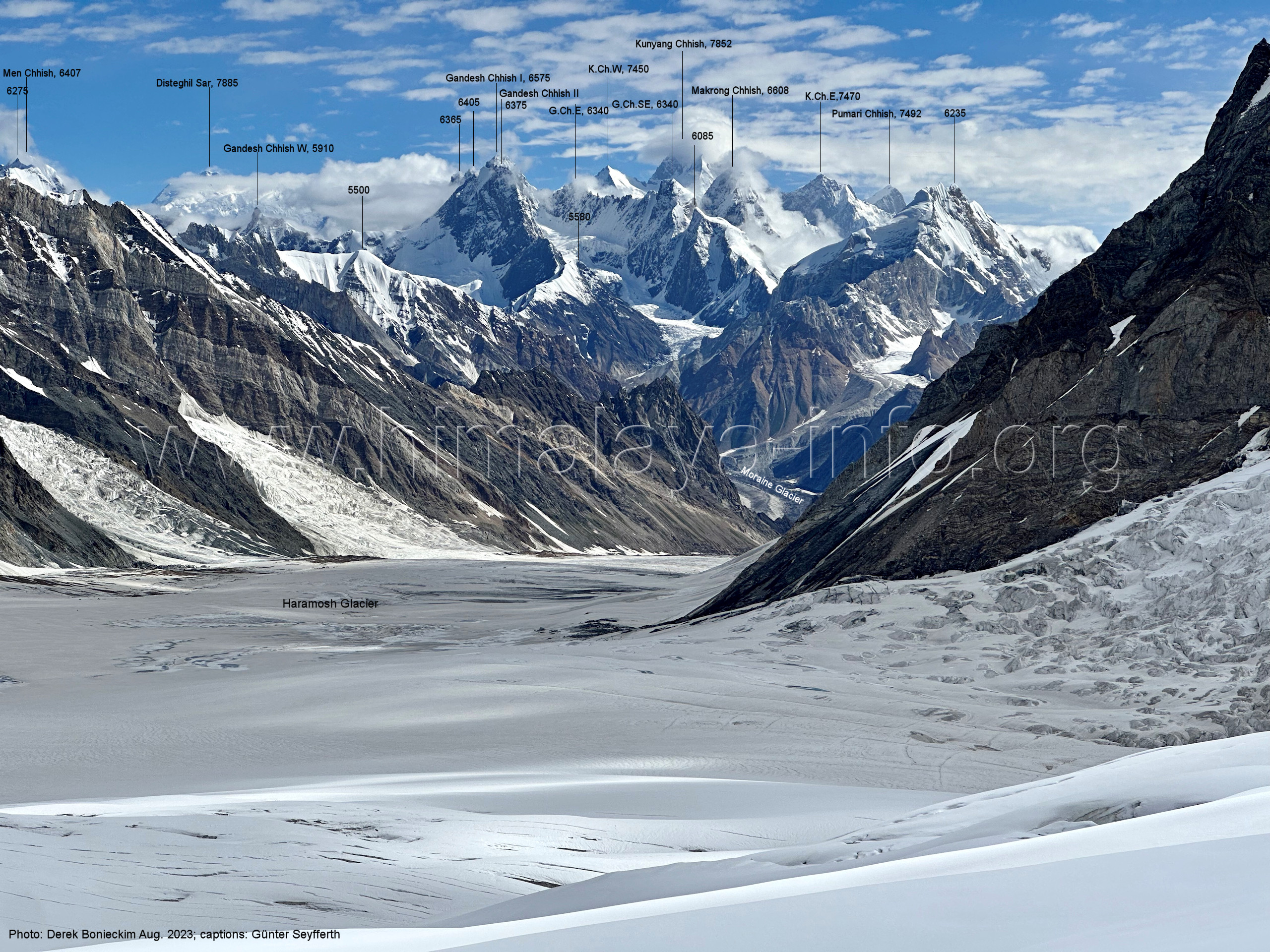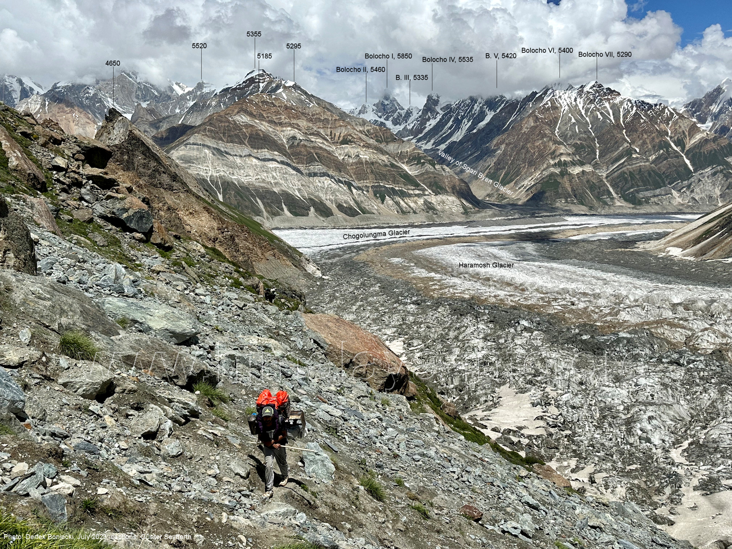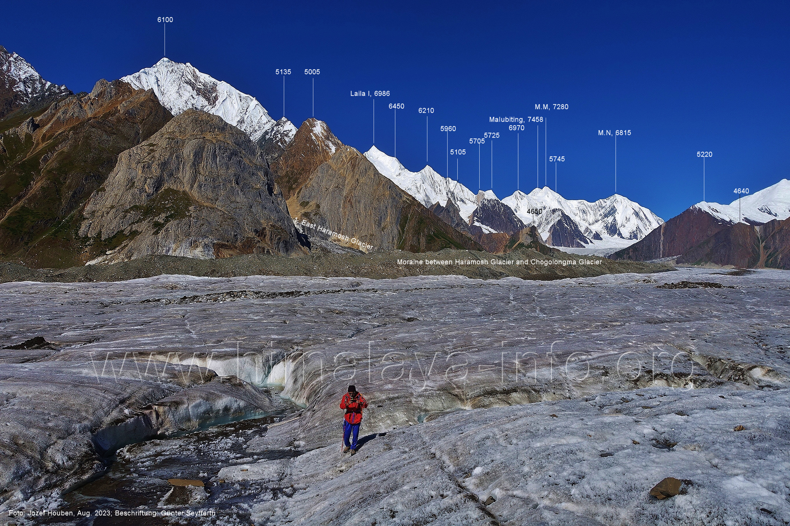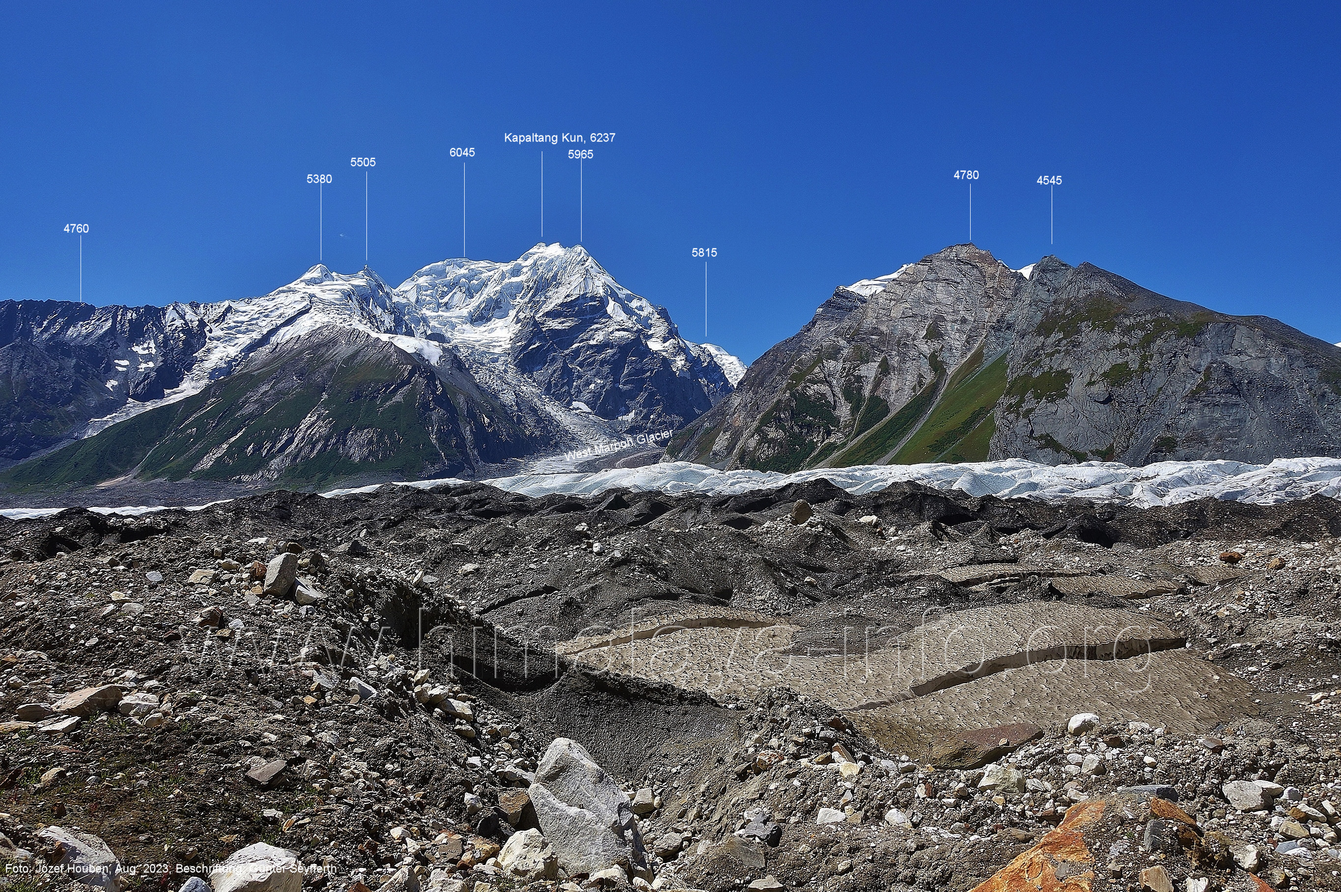 Mittelmoräne zwischen dem Eis des Chogolungma-Gletschers (vorne) Foto: Jozef Houben, Aug. 2023; Beschriftung: Günter Seyfferth (72) Blick bei 75°05'20" nach Westen zum Malubiting (7458 m)