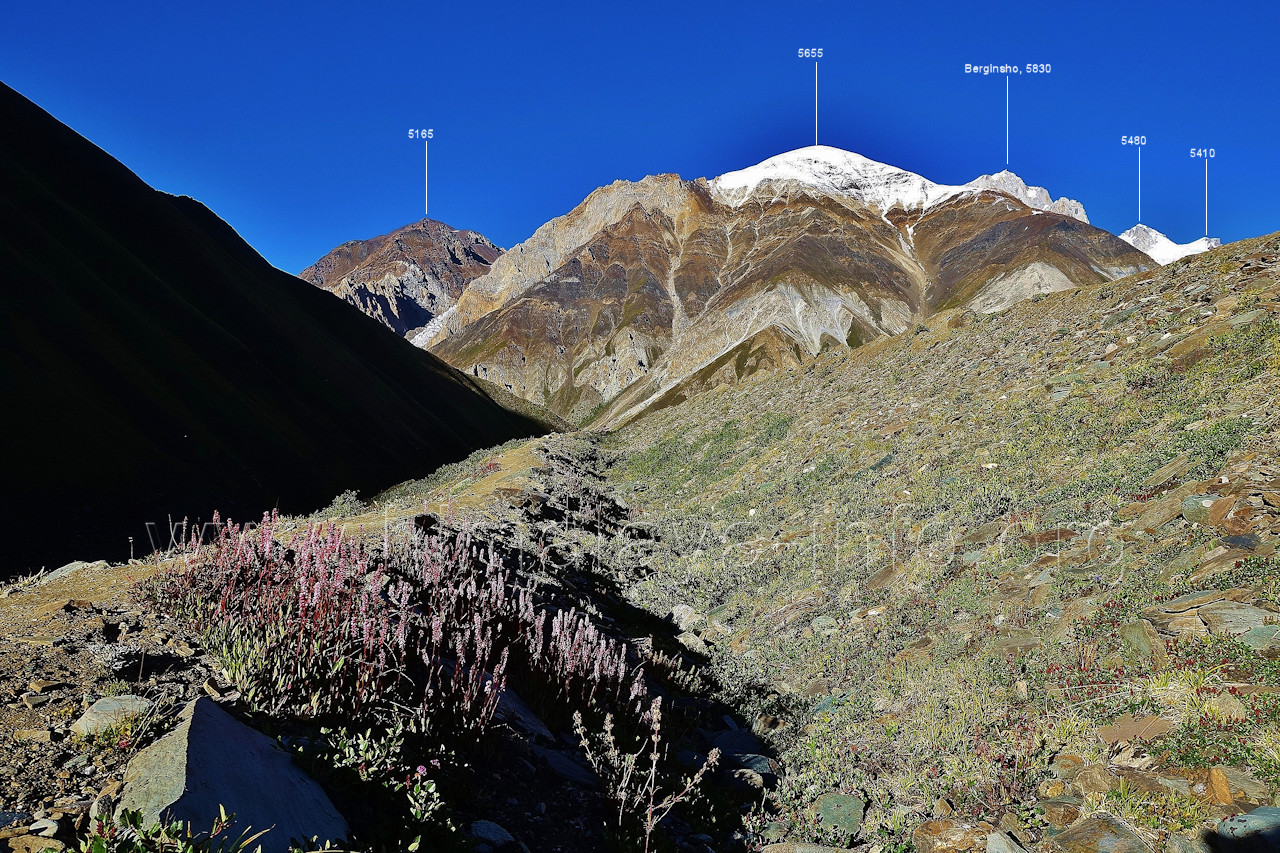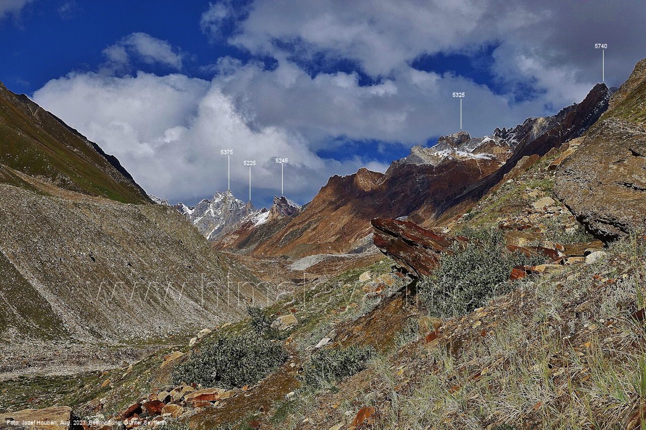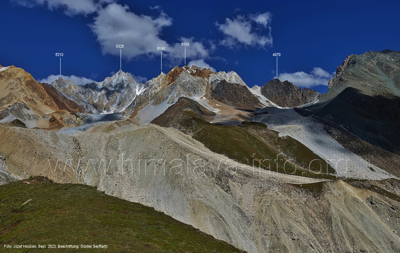 Hinter diesen Gipfeln liegt der obere Bolocho-Gletscher. Foto: Jozef Houben, Aug. 2023; Beschriftung: Günter Seyfferth Das folgende Bild reicht etwas weiter nach links: (213) Blick aus ca. 4670 m Höhe am Nordhang des Kero-Lungma-Tals nach West-Nordwesten Foto: Jozef Houben, Aug. 2023; Beschriftung: Günter Seyfferth (214) Blick aus ca. 4670 m Höhe am Nordhang des Kero-Lungma-Tals nach Südosten Foto: Jozef Houben, Aug. 2023; Beschriftung: Günter Seyfferth (215) Blick aus ca. 4670 m Höhe am Nordhang des Kero-Lungma-Tals nach Nordosten