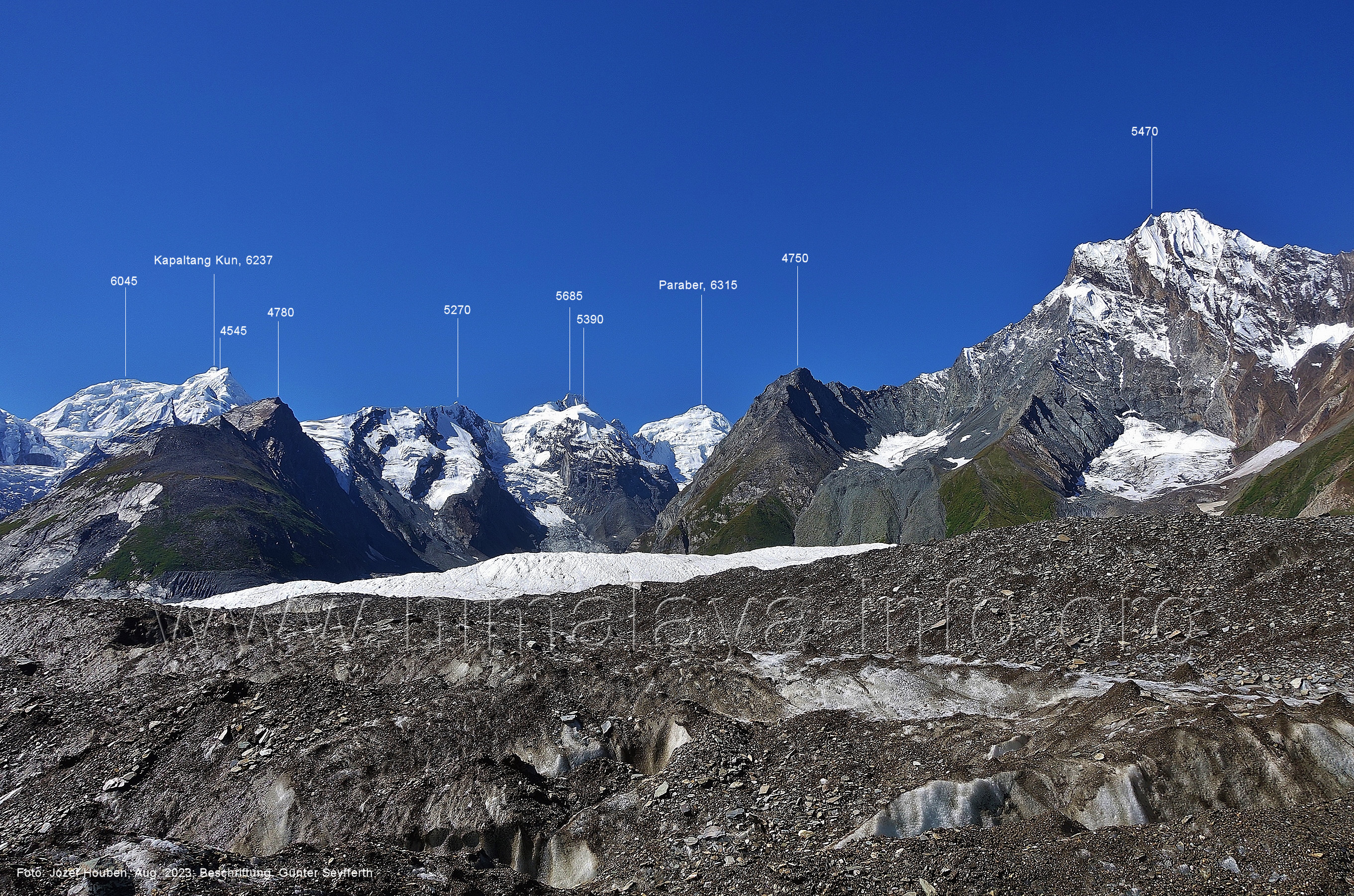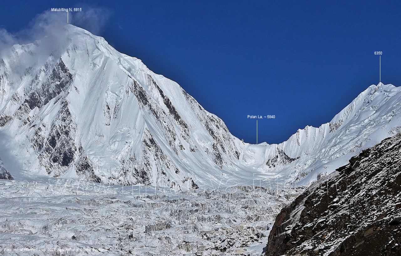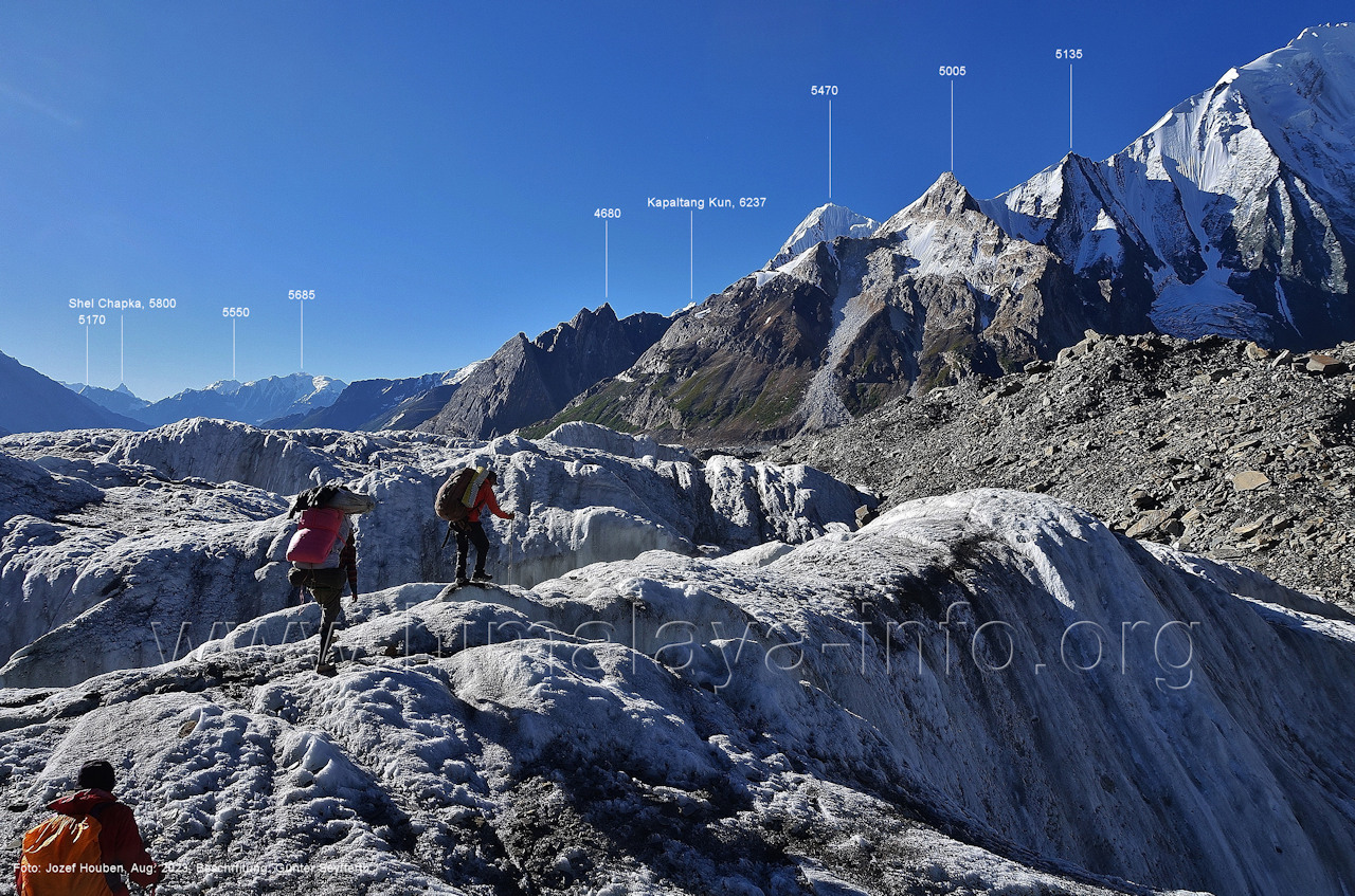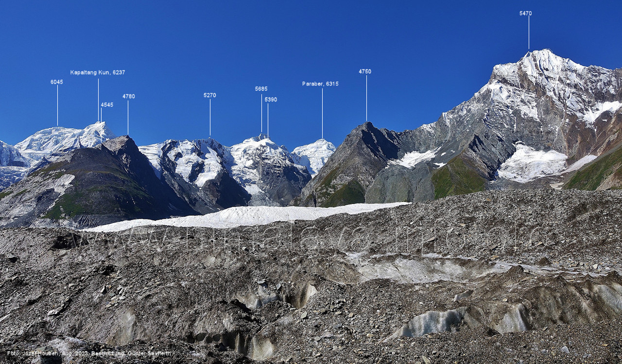 der für den weiteren Anstieg bessere Verhältnisse bietet. Foto: Jozef Houben, Aug. 2023; Beschriftung: Günter Seyfferth Das folgende Foto zeigt die Mündung des Bolocho-Tals, wo man den Gletscher betreten hat: (62) Rückblick bei 75°06'27" nach Osten zur Mündung des Bolocho-Tals und zum Shingu Kuru (5990 m) Foto: Jozef Houben, Aug. 2023; Beschriftung: Günter Seyfferth (63) Rückblick bei 75°06'16" nach Südosten mit Shingu Kuru (5990 m), Berginsho (5830 m) und Kapaltang Kun (6237 m) Foto: Jozef Houben, Aug. 2023; Beschriftung: Günter Seyfferth (64) Blick bei 75°06'15" nach Süden mit Kapaltang Kun (6237 m) und Paraber (6315 m) Foto: Jozef Houben, Aug. 2023; Beschriftung: Günter Seyfferth