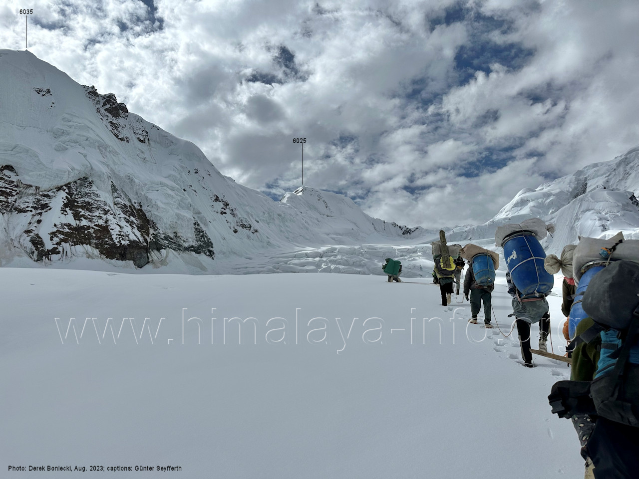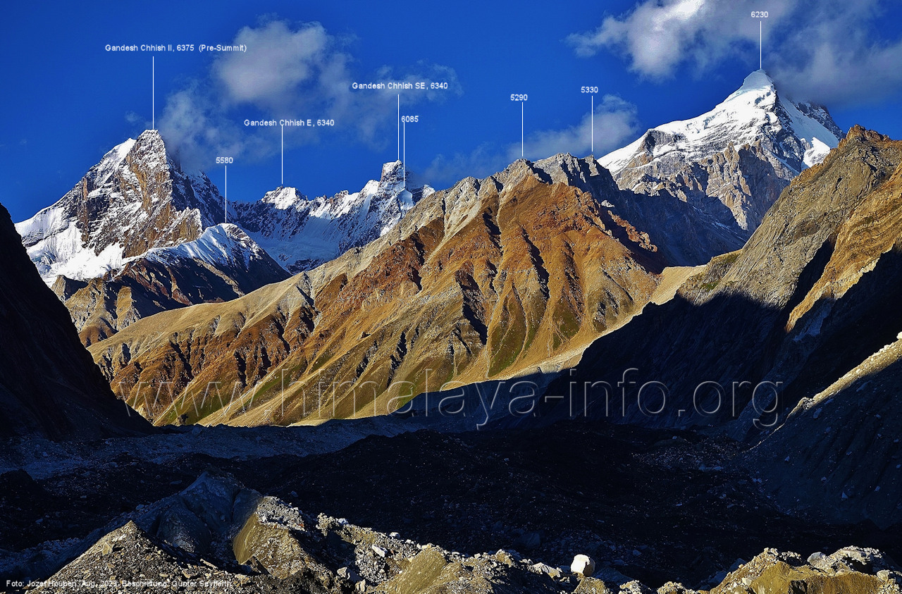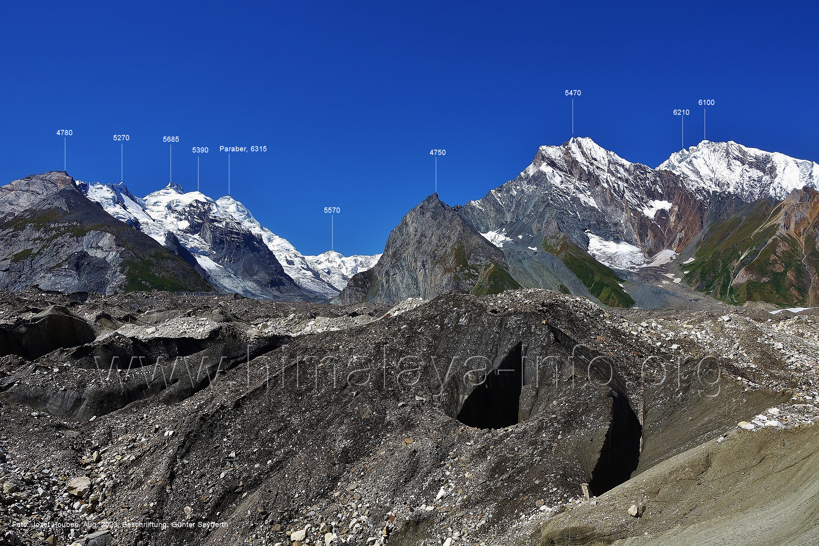 der für den weiteren Anstieg bessere Verhältnisse bietet. Foto: Jozef Houben, Aug. 2023; Beschriftung: Günter Seyfferth Das folgende Foto zeigt die Mündung des Bolocho-Tals, wo man den Gletscher betreten hat: (62) Rückblick bei 75°06'27" nach Osten zur Mündung des Bolocho-Tals und zum Shingu Kuru (5990 m) Foto: Jozef Houben, Aug. 2023; Beschriftung: Günter Seyfferth (63) Rückblick bei 75°06'16" nach Südosten mit Shingu Kuru (5990 m), Berginsho (5830 m) und Kapaltang Kun (6237 m) Foto: Jozef Houben, Aug. 2023; Beschriftung: Günter Seyfferth (64) Blick bei 75°06'15" nach Süden mit Kapaltang Kun (6237 m) und Paraber (6315 m) Foto: Jozef Houben, Aug. 2023; Beschriftung: Günter Seyfferth