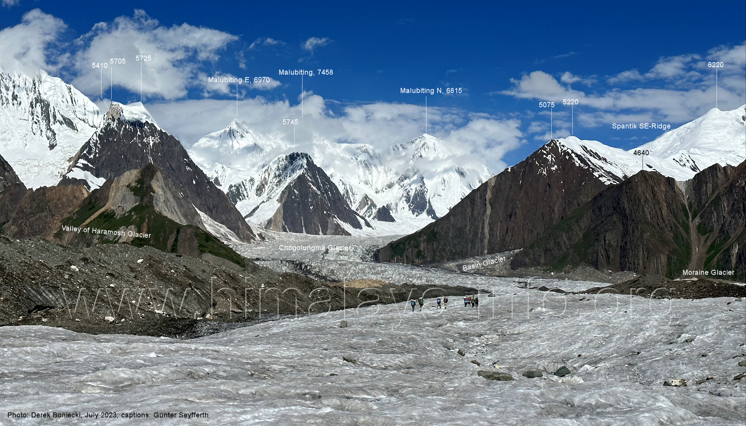 gefärbte Schmelzwasser in den Chogolungma-Gletscher ergießen. Foto: Jozef Houben, Aug. 2023; Beschriftung: Günter Seyfferth (33) Rückblick bei 75°11'56" nach Süd-Südosten Foto: Jozef Houben, Aug. 2023; Beschriftung: Günter Seyfferth (34) Blick bei 75°11'40 " nach West-Nordwesten mit Haramosh II (6666 m), Malubiting (7458 m) und Spantik (7026 m) Voraus hat man ab hier nun auch den Malubiting im Blick, den höchsten Gipfel der Chogolungma-Region. Foto: Jozef Houben, Aug. 2023; Beschriftung: Günter Seyfferth (35) Blick bei 75°11'38" (H = 3575 m) nach Süden