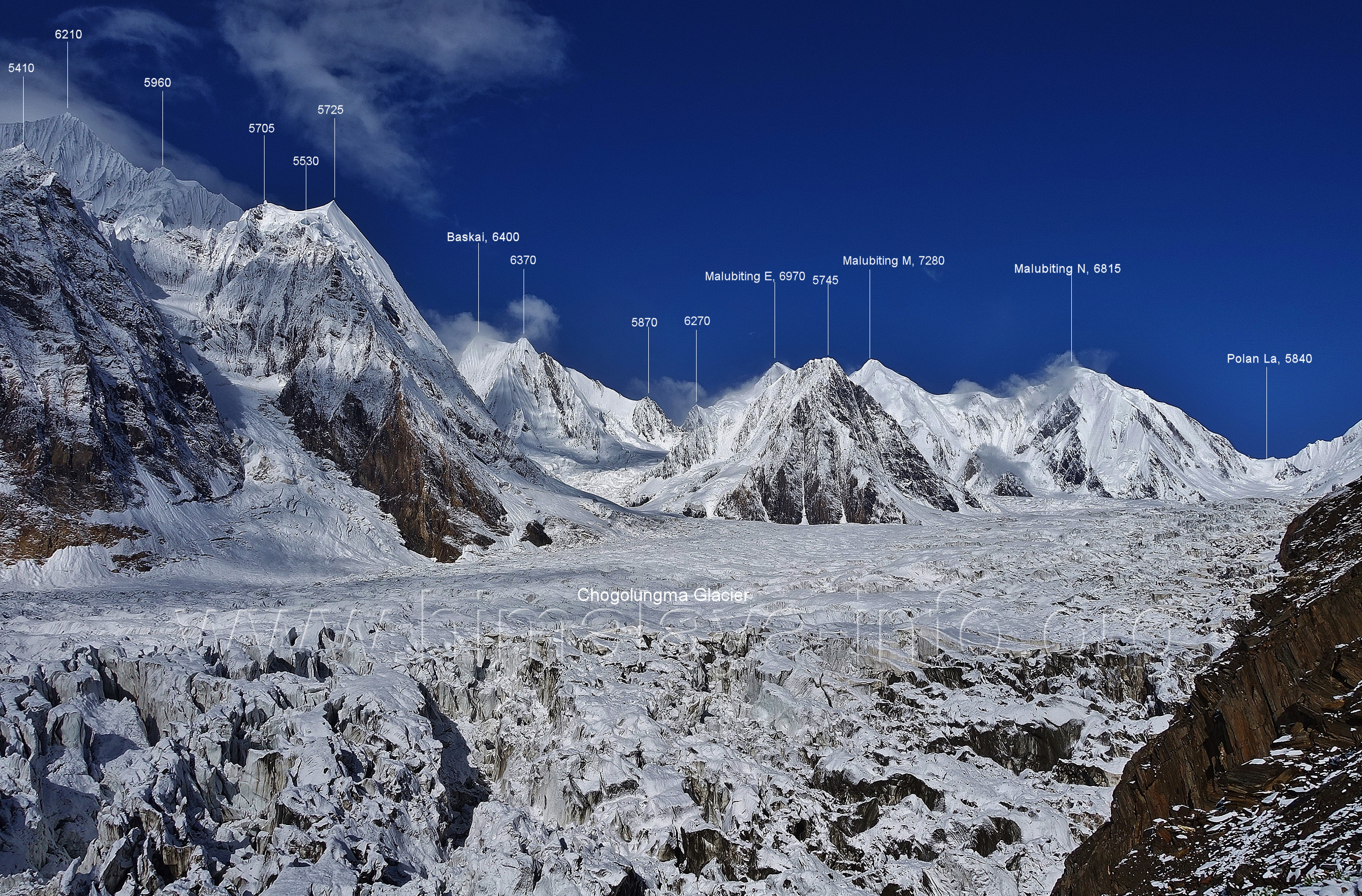 Hispar-Gletschers und des Chogolungma-Gletschers Eine weitere Landkarte der Region um den Chogolungma-Gletscher mit weniger Details finden Sie hier.