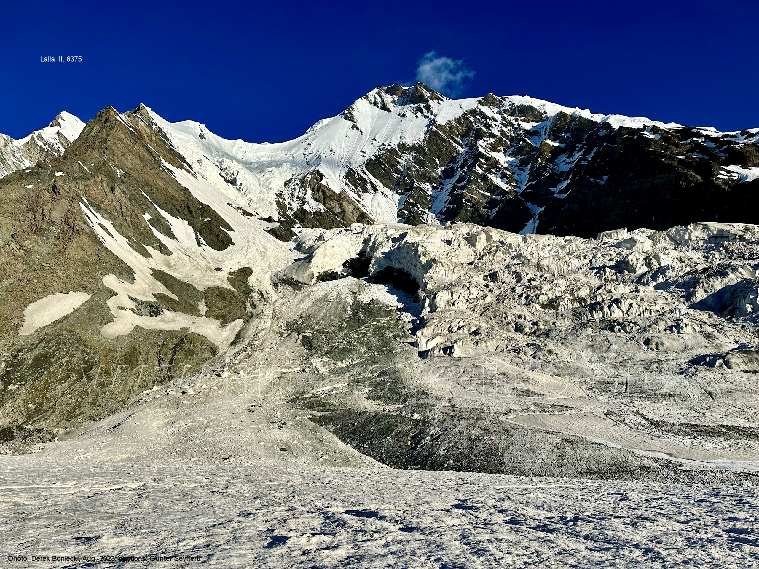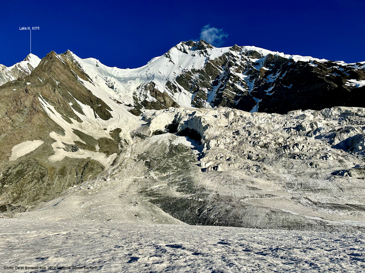 Links ist noch der Vorgipfel 6210 des Laila I zu sehen. Davor