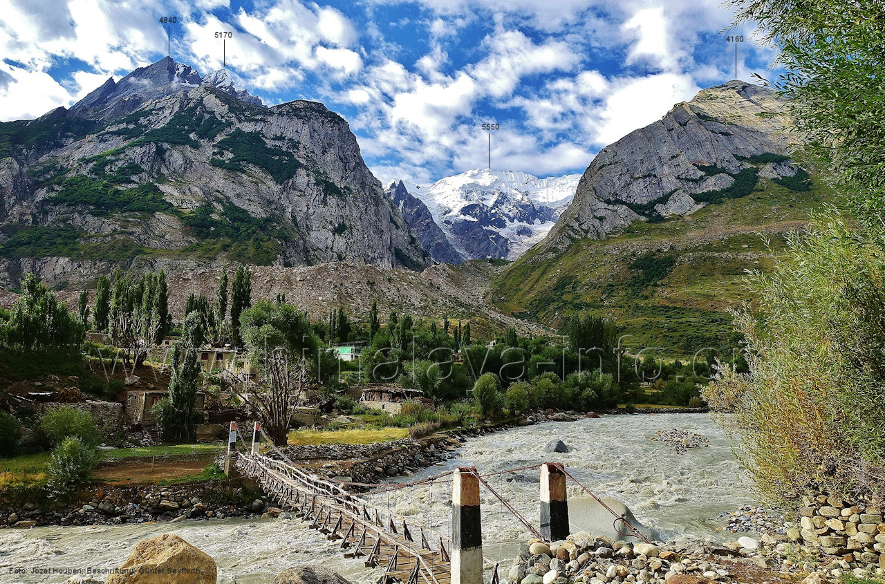 Übergang zum Fuß am Westhang des Tales suchen. (221) Blick aus ca. 3650 m Höhe zu dem nach Süd-Südosten gerichteten Abschnitt des Kero Lungma-Tals Hinter den Bergen auf der linken Talseite liegt das Tal des Berelter Nala, dem Abfluss der Gletscher Solu und Sokha. Foto: Jozef Houben, Aug. 2023; Beschriftung: Günter Seyfferth (222) Blick entlang des unteren Abschnitts des Kero Lungma-Tals in Richtung Arandu Im Hintergrund, also jenseits von Arandu, sieht man Gipfel der Berggruppe des Berginsho (5830 m). Foto: Jozef Houben, Aug. 2023; Beschriftung: Günter Seyfferth (223) Rückblick zur Talmündung des Kero Langma in das Tal des Chogolungma-Gletschers bei Arandu Foto: Inna Yagudina (224) Blick von der Brücke über den Basha River bei Arandu nach Süden mit dem Seitental des Tippuri Gans Foto: Jozef Houben, Aug. 2023; Beschriftung: Günter Seyfferth F. Naamur Gans und Tormik La (4950 m)