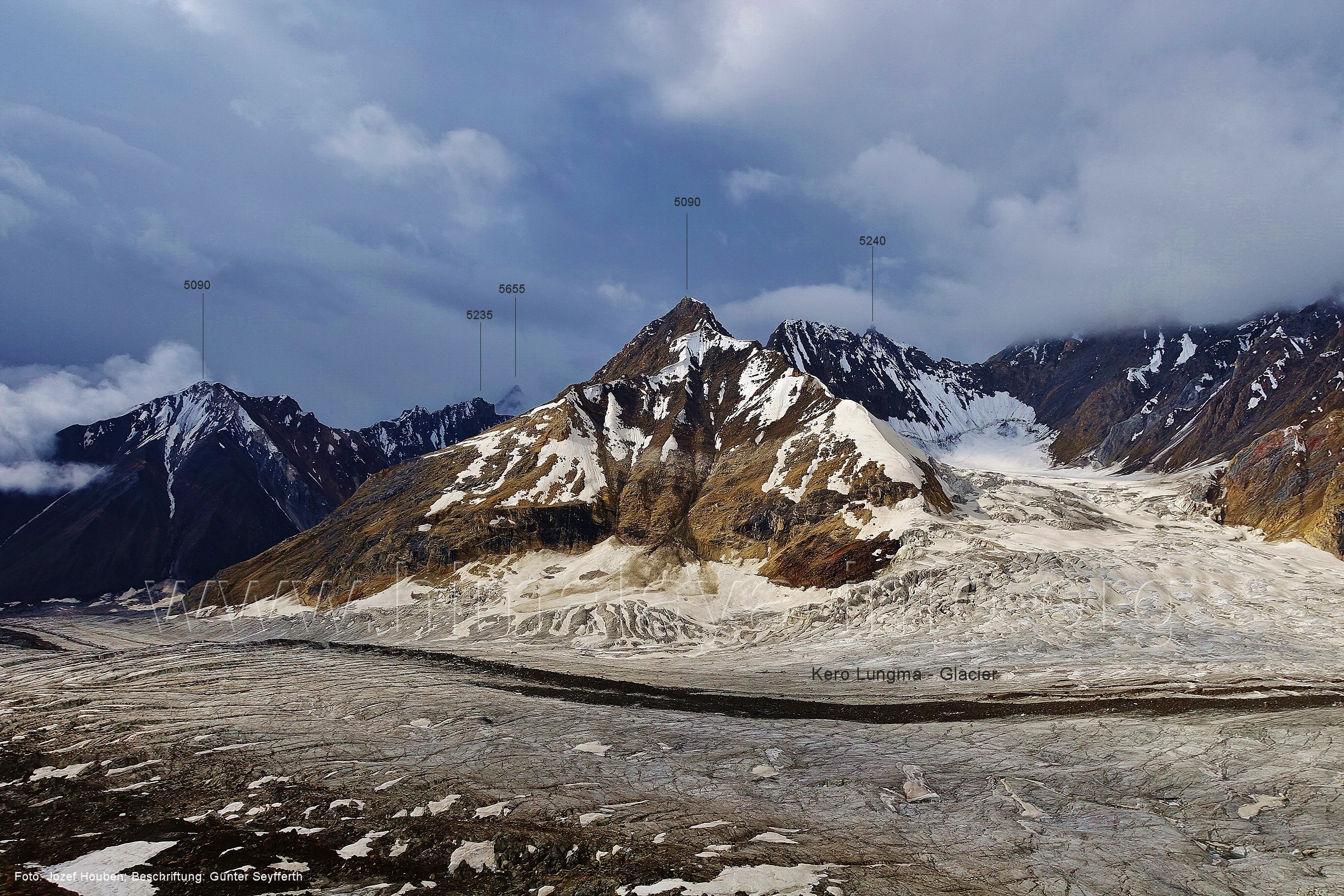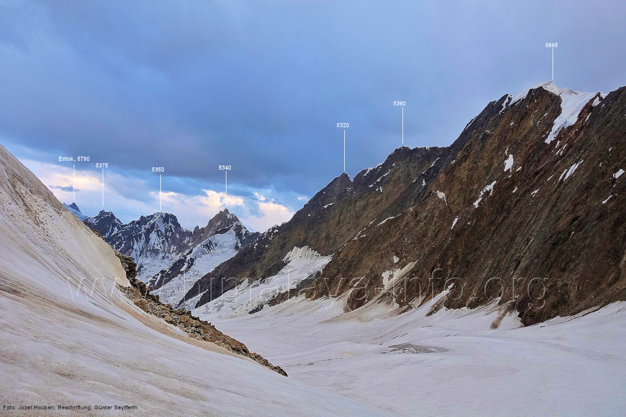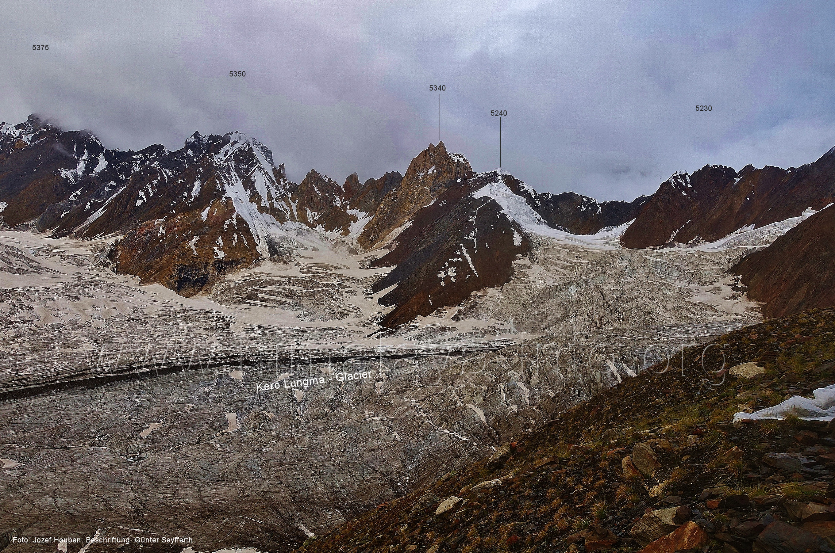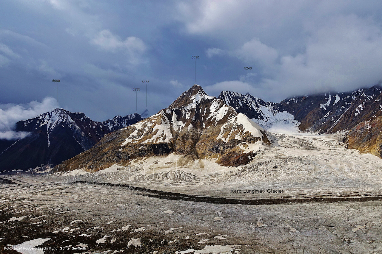 und Kero Lungma-Gletscher, Foto: Jozef Houben, Aug. 2023; Beschriftung: Günter Seyfferth (216) Blick aus ca. 4650 m Höhe am Nordhang des Kero-Lungma-Tals nach Osten Man ist soeben vom Lager in 4670 m Höhe aufgebrochen. Foto: Jozef Houben, Aug. 2023; Beschriftung: Günter Seyfferth Regenwolken verhüllten zeitweise die Berge, so dass erst am Nachmittag und ca. 1000 m tiefer wieder die Konturen der Berge sichtbar wurden. An dieser Stelle der Beschreibung wird das folgende