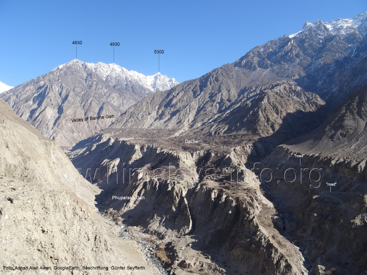 Es ist der Blick talabwärts über den Ort Stak und das Indus-Tal hinweg. Foto: Felix Kugele, Jan. 2017; Beschriftung: Günter Seyfferth (284) Blick von einem Standort am Hang nordöstlich der Zunge des Khotia Lungma-Gletschers nach Südwesten zum Diphungy (5940 m) Weil dieses Foto aus GoogleEarth den Diphungy so herrlich bei Sonnenuntergang zeigt, sei es auch hier gezeigt. Foto: Ephrem Ferrari, GoogleEarth (285) Blick von einem Standort am Hang nordöstlich der Zunge des Khotia Lungma-Gletschers nach Norden zum Goropha-Gletscher