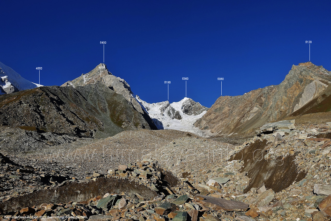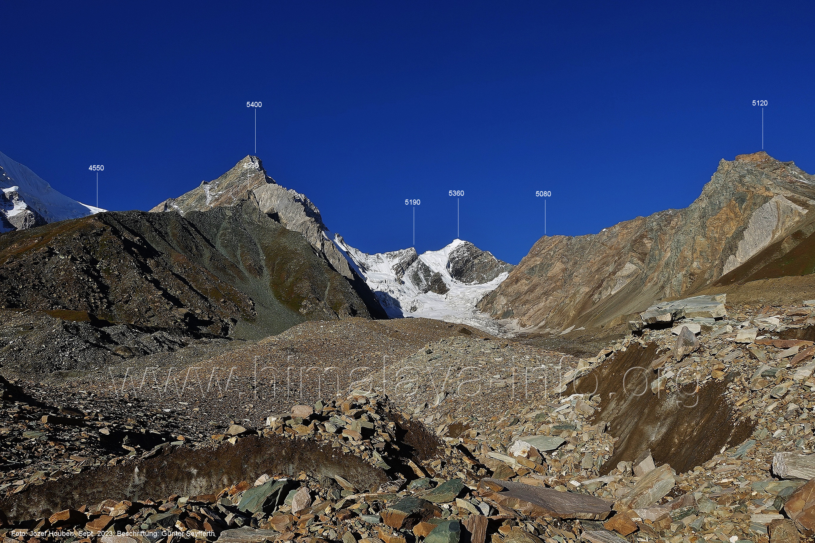 Teil der Berge auf der anderen Seite des Gletschers. Foto: Jozef Houben, Aug. 2023; Beschriftung: Günter Seyfferth (24) Tele-Blick bei 75°13'35" nach Nordwesten zum Spantik (7027 m)
