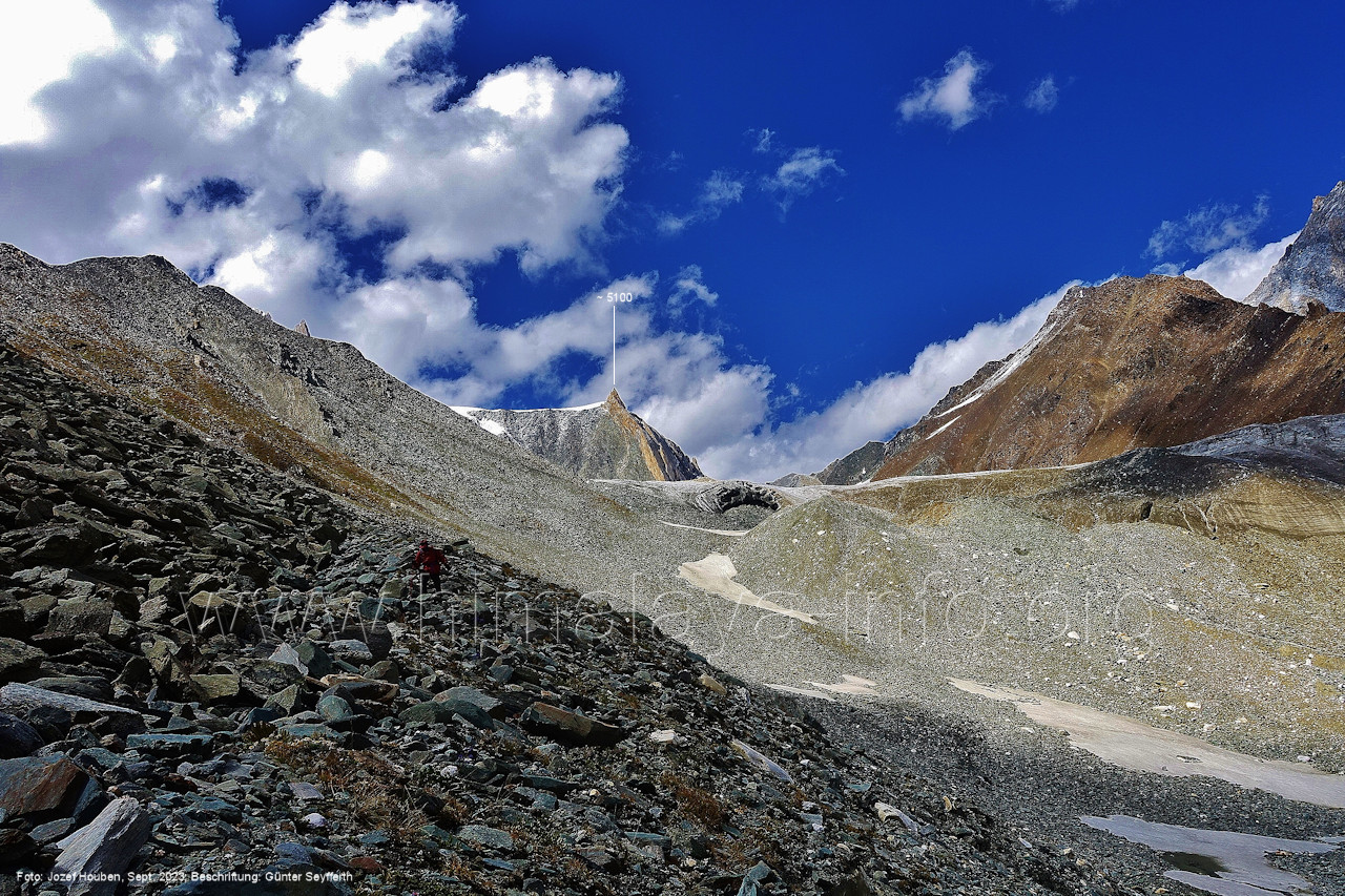 absteigenden Trekkers. Foto: Jozef Houben, Aug. 2023; Beschriftung: Günter Seyfferth (47) Blick bei 75°08'10" (H = 3810 m) nach Südosten