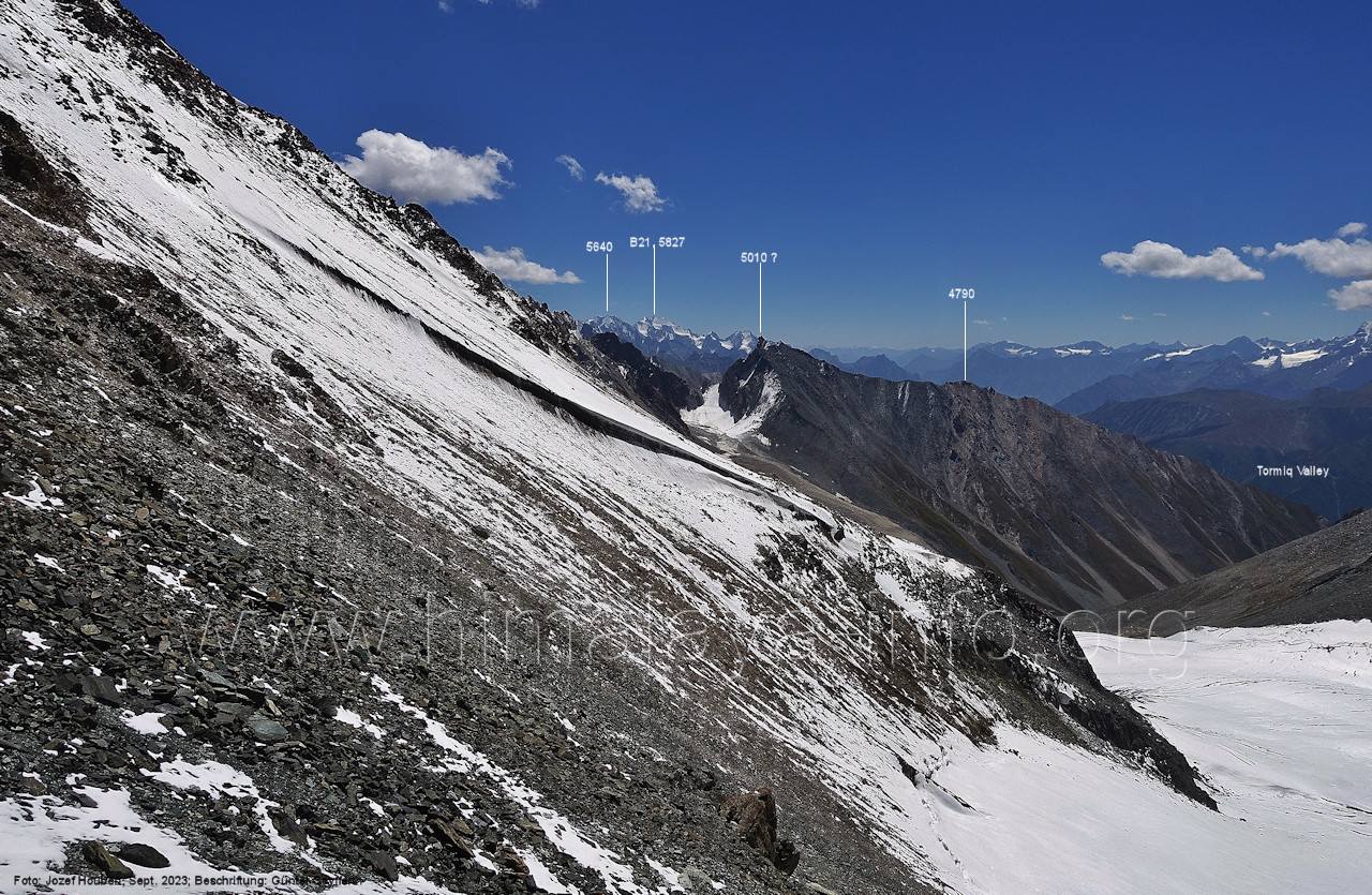 Chogolungma-Gletschers immer vor dem Spantik gesehen hat. Foto: Jozef Houben, Aug. 2023; Beschriftung: Günter Seyfferth Beim Blick nach Südwesten kommt nun auch der Haramosh I (7406 m) in Sicht: (81) Blick bei 75°03'30" nach Südwesten mit Haramosh I (7406 m) und Laila I (6986 m)