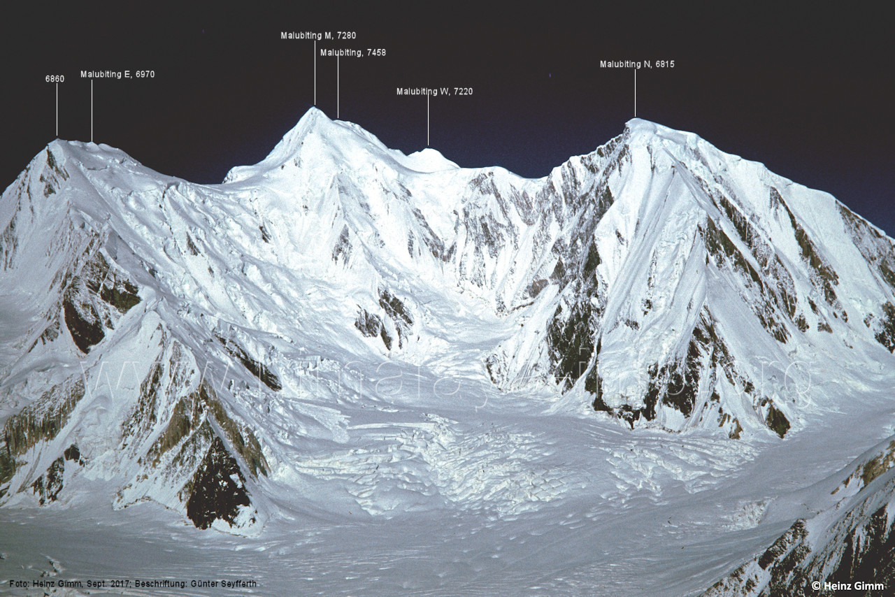 Shingu Kuru (5990 m) sieht, Foto: Jozef Houben, Aug. 2023; Beschriftung: Günter Seyfferth (40) Blick bei 75°09'23" nach West-Nordwesten zum Malubiting (7458 m) Foto: Jozef Houben, Aug. 2023; Beschriftung: Günter Seyfferth (41) Blick bei 75°09'15" (H = 3740 m)nach Südwesten zum Paraber (6315 m) Dieser Berg war bisher durch den Kapaltang Kun verdeckt, dessen nach Norden gerichteten Grat man links sieht. Foto: Jozef Houben, Aug. 2023; Beschriftung: Günter Seyfferth (42) Rückblick bei 75°09'11" nach Südosten Foto: Jozef Houben, Aug. 2023; Beschriftung: Günter Seyfferth (42) Blick bei 75°09'11" (H = 3740 m) nach Westen mit Haramosh II (6666 m) und Malubiting (7548 m) Foto: Jozef Houben, Aug. 2023; Beschriftung: Günter Seyfferth (43) Blick bei 75°09'10" nach Süd-Südwesten zum Kapaltang Kun (6237 m) und Paraber (6315 m) Am Kapaltang Kun sieht man hier zum mittleren und westlichen Gratausläufer.
