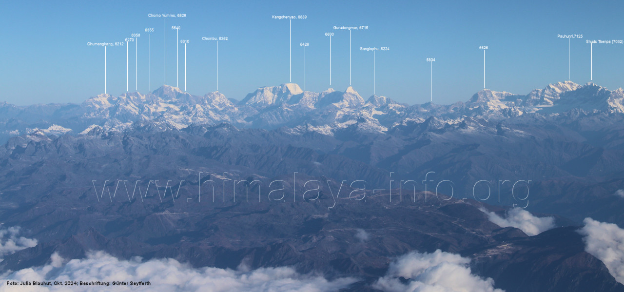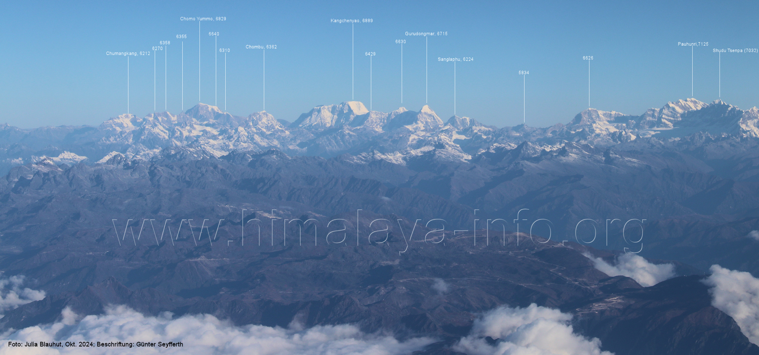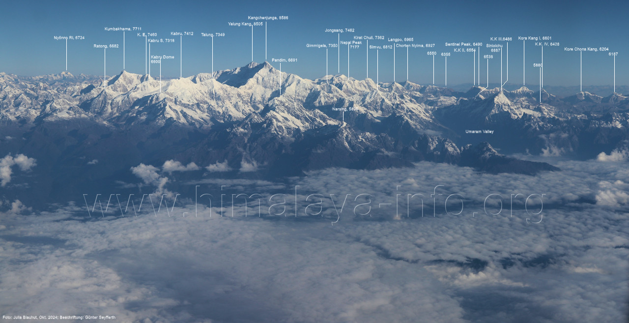 Himalaya auf. Foto: Roger Nix, flickr.com; Beschriftung: Günter Seyfferth (175) Yangma-Gipfel und Kangchenjunga-Massiv von Süden Foto: CamelKW, flickr.com; Beschriftung: Günter Seyfferth Während des Vorbeiflugs "wandert" das Kabru-Massiv in Relation zum Kangenjunga von rechts nach links: (176) Kangchenjuna-Massiv von Süden mit dem vorgelagerten Massiv des Kabru (7412 m) Rechts liegt das Tal des Prek Chu, das den Himalaya-Trekkern als Route zum Pass Goecha La bekannt ist. Foto: unbekannt; Beschriftung: Günter Seyfferth Etwas mehr von den vielen Details lässt das folgenden Foto erkennen: (177) Kangchenjuna-Massiv und Jongsang Peak (7462 m) von Süden mit dem vorgelagerten Massiv des Kabru (7412 m) Foto: Doug Beecroft Photography; Beschriftung: Günter Seyfferth (178) Östlicher Teil des Kangchenjunga-Massiv mit Simvu (6812 m), Pandim (6691 m) und Siniolchu (6887 m) von Süden Im Hintergrund rechts des Kangchenjunga steht die Gipfelkette zwischen Sikkim und Tibet. Foto: CamelKW, flickr.com; Beschriftung: Günter Seyfferth (179) Sikkim - Himalaya von Südwesten Foto: CamelKW, flickr.com; Beschriftung: Günter Seyfferth (179a) Blick von Süd-Südosten zur gesamten Kangchenjunga-Region Die linke Bildhälfte zeigt den nepalesischen Teil der Region, die rechte Bildhälfte den indischen Teil (Sikkim). Foto: Julia Blauhut, Okt.2024; Beschriftung: Günter Seyfferth (180) Pandim (6691 m), Siniolchu (6887 m), Chomo Yummo (6829 m), Kangchenyao (6889 m) und Gurudongmar (6715 m) von Südwesten Foto: CamelKW, flickr.com; Beschriftung: Günter Seyfferth (181) Kangchenyao (6889 m) und Gurudongmar (6715 m) von Südwesten Foto: CamelKW, flickr.com; Beschriftung: Günter Seyfferth (182) Siniolchu (6887 m), Chomo Yummo (6829 m), Kangchenyao (6889 m) und Gurudongmar (6715 m) von Süden Foto: CamelKW, flickr.com; Beschriftung: Günter Seyfferth (183) Pauhunri (7125 m) und Shudu Tsenpa (7032 m) von Südwesten Am Pauhunri wendet sich die von Westen kommende Staatsgrenze zwischen Nepal und China nach Süden. Foto: CamelKW, flickr.com; Beschriftung: Günter Seyfferth (183 a) Blick zu den bergen des östlichen Sikkim mit Chomo Yummo (6829 m), Kangchenyao (6889 m) und Pauhunri (7125 m) Foto: Julia Blauhut, Okt. 2024; Beschriftung: Günter Seyfferth