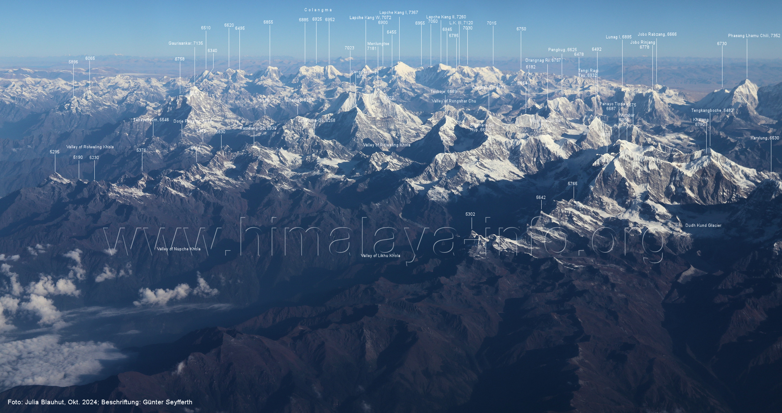 Die Tele-Aufnahme ist aus dem Bereich südlich des Gaurisankar gemacht. Foto unbekannt; Beschriftung: Günter Seyfferth Luftbilder des Lapche Himal und des Rolwaling Himal Die Beschreibung der Region von Lapche Himal und Rolwaling Himal finden Sie unter folgenden Links: