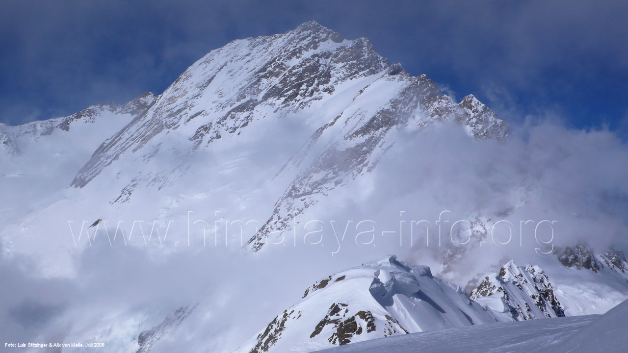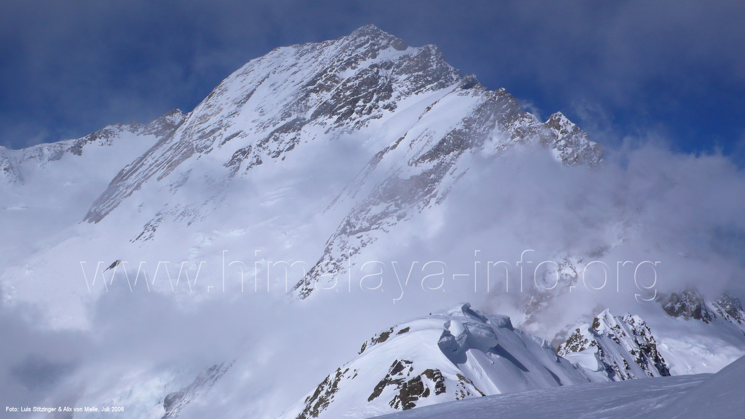 rechts durch das weite Gletscherfeld unter den Gipfelaufbau und führt dort steil hinauf direkt in Richtung Gipfel.