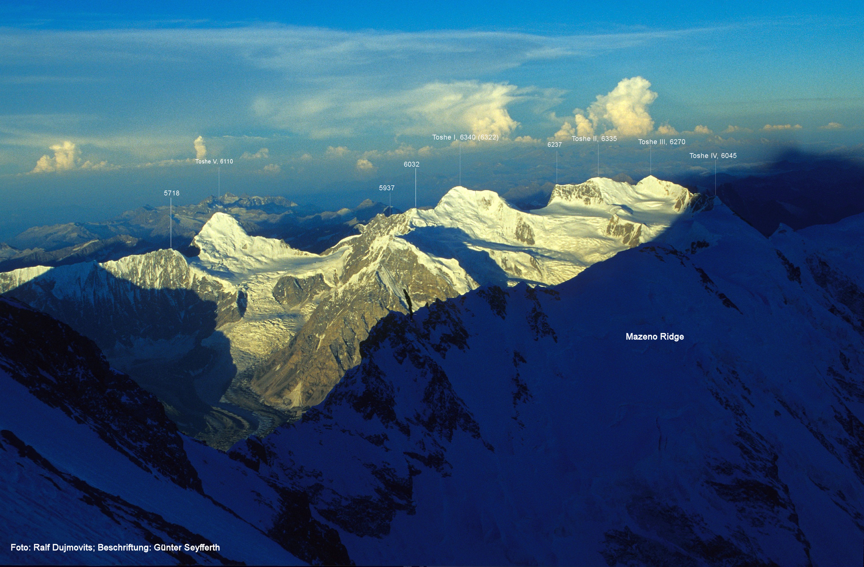möglich war. Andernfalls wäre in dieser Beschreibung auch ein Panoramabild vom Gipfel auf die Berge der Toshe-Gruppe