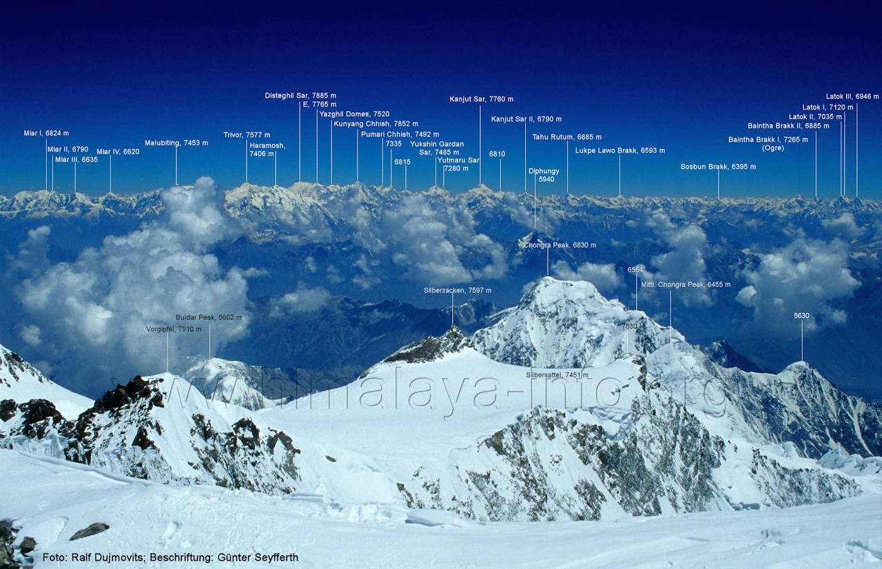 (7120 m) im gleichnamigen Westgrat, der Rakhiot Peak (7070 m) und der Chongra Peak (6830 m) im Nordostgrat sowie der Ganalo Peak