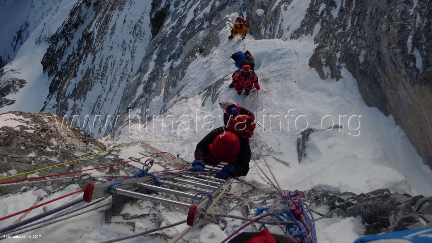 Am Fuß des Second Step wartet ein Bergsteiger und sichert einen Kollegen. Rechts hat ein Bergsteiger das obere Ende der Leiter