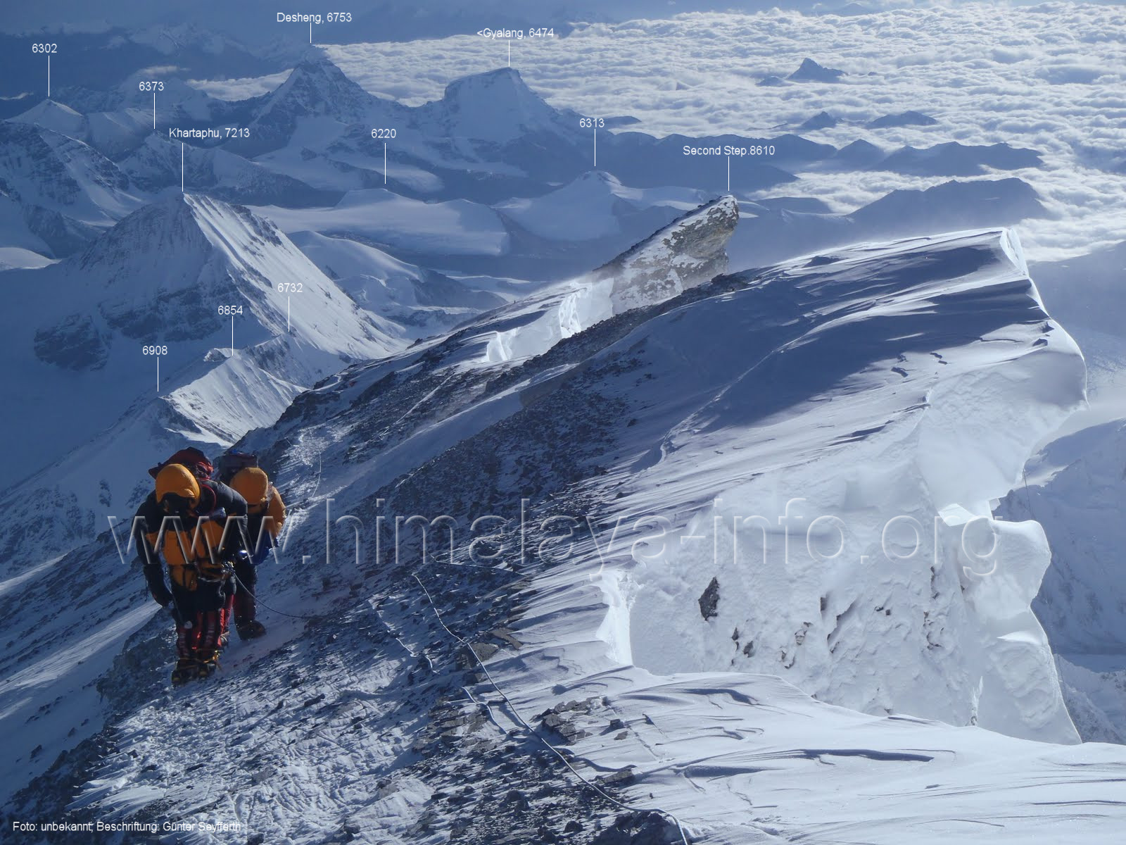 (55) Blick aus ca. 8620 m Höhe oberhalb des Second Step nach Nordosten mit dem Felsgipfel des Second