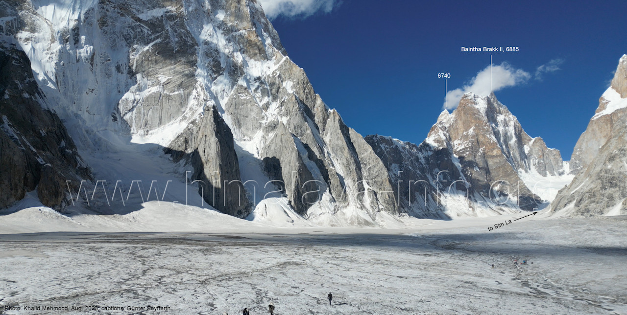 dem oberen Choktoi-Gletscher und am Sim La (B-1) Bei 35°56'50" N, 75°53'15" E mit Blick nach Süden Man sieht die beiden südlichen Gipfel der Latok-Gruppe Latok IV (6470 m) und Latok V (6145 m) Foto: Derek Boniecki, 16. Juli 2023; Beschriftung: Günter Seyfferth (B-2) Bei 35°57'08" N, 75°50'09" mit Blick nach West-Südwesten zum Baintha Brakk II (6885 m) Links sieht man zum Fuß der Nordwand des Latok I (7120 m) Foto: Khalid Mehmood, 21.08.2023; Beschriftung: Günter Seyfferth (B-3) Bei 35°57'08" N, 75°50'09" E mit Blick nach Westen zum Baintha Brak II (6885 m) und Baintha Brakk I (7270 m) Die Aufstiegsroute zum Sim La verläuft zwischen Peak 5680 und Baintha Brakk I. Foto: Khalid Mehmood, 21.08.2023; Beschriftung: Günter Seyfferth (B-4) Blick von Südosten zum Sim La (5440 m) Foto: Khalid Mehmood, 20.08.2023; Beschriftung: Günter Seyfferth (B-5) Blick von Südosten auf den Gletscherbruch unter dem Sim La Die Aufstiegsroute verläuft auf