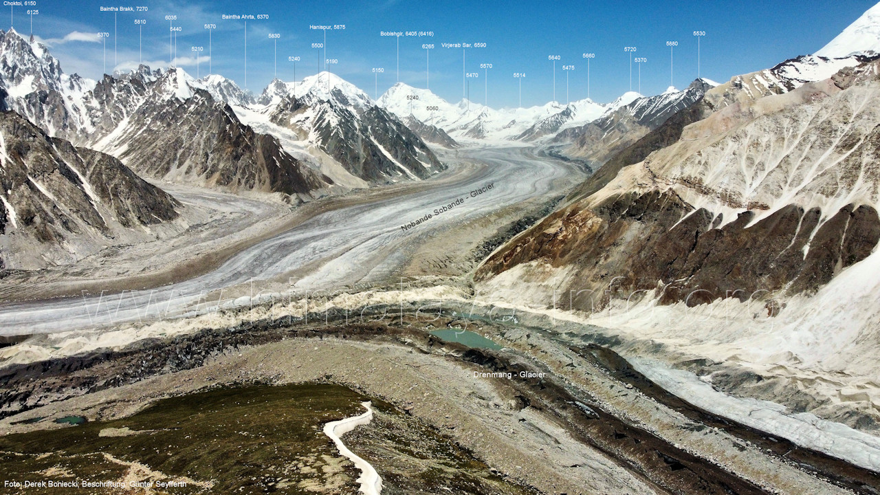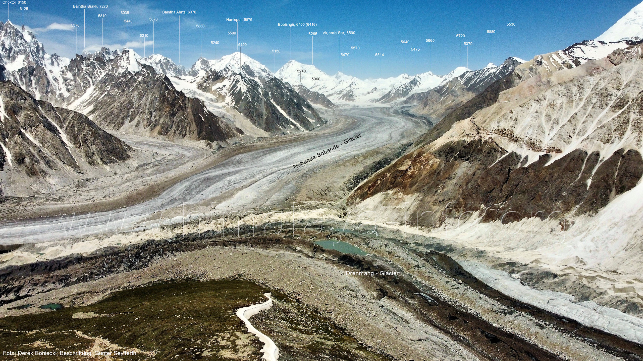 Sobande-Gletscher und auf den von Osten einmündenden Drenmang-Gletscher. Foto: Derek Boniecki, 7. Aug. 2023; Beschriftung: Günter Seyfferth (C-3) Blick nach Nordwesten bis Norden In Bildmitte sieht man die Mündung des