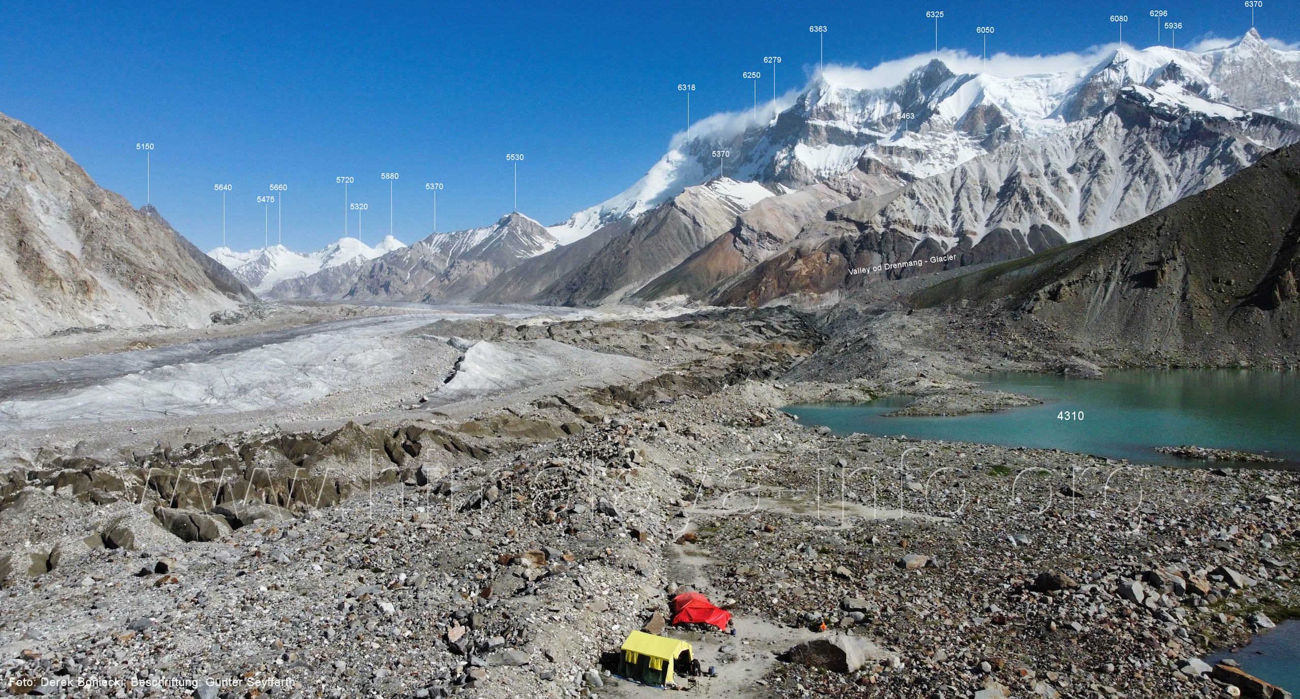Panmah-Gletscher. (A1-1) Blick enlang des Panmah-Gletschers nach Süden Wenn man von Süden durch das Dumord-Tal heraufkommt, wird am markierten Rastplatz Panmah in 4385 m Höhe vor der Stirnmoräne des Gletschers gezeltet. Foto: Khalid Mehmood, 21.08.2023; Beschriftung: Günter Seyfferth (A-2) Blick nach Nordosten zum Nobande Sobande-Gletscher mit dem Massiv des Skamri (6745 m)Hier geht der Blick auf den Punkt der