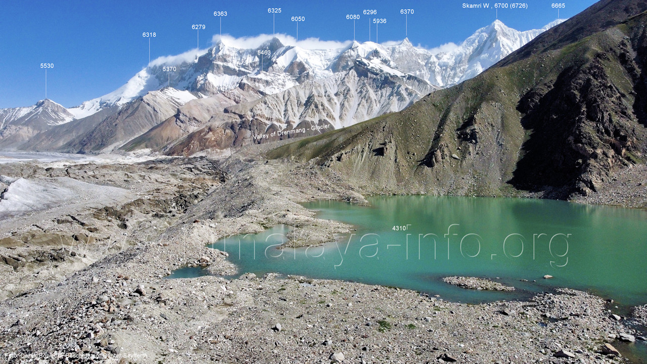 Drenmang-Gletschers in den Nobande Sobande-Gletscher, Foto: Derek Boniecki, 7. Aug. 2023; Beschriftung: Günter Seyfferth (C-4) Blick nach Nord-Nordosten zu den westlichen Gipfeln des Skamri-Massivs Über diese Gipfel verläuft die Grenze zu China. Foto: Derek Boniecki, 7. Aug. 2023; Beschriftung: Günter Seyfferth D.Startpunkt