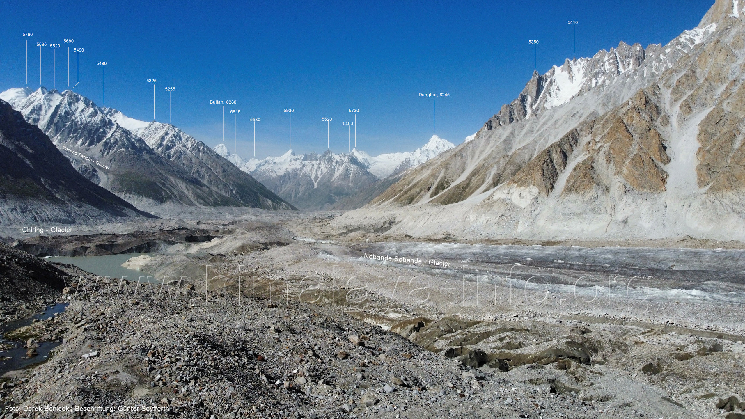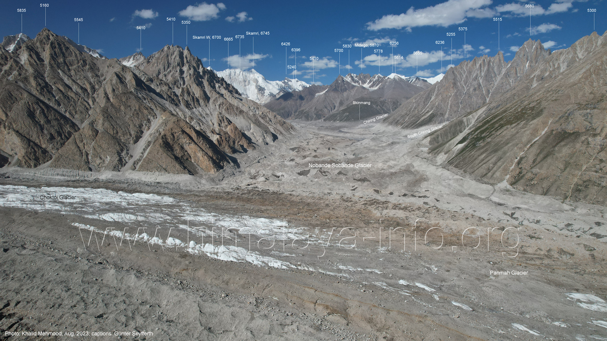 Startopunkt war ein Lager an dem See zwischen Nobande Sobande-Gletscher und dem östlichen Hangfuß; siehe Bild Nr. C-3. (C-1) Blick nach Südwesten entlang des unteren Nobande Sobande-Gletschers Hinter der Gipfelkette mit Bullah (6280 m) und Dongbar (6265 m) liegt der Biafo-Gletscher. Foto: Derek Boniecki, 7. Aug. 2023; Beschriftung: Günter Seyfferth (C-2) Blick nach Westen mit Choktoi (6150 m), Hanispur (5875 m) und Bobishgir (6405 m) Unten geht der Blick auf den Nobande