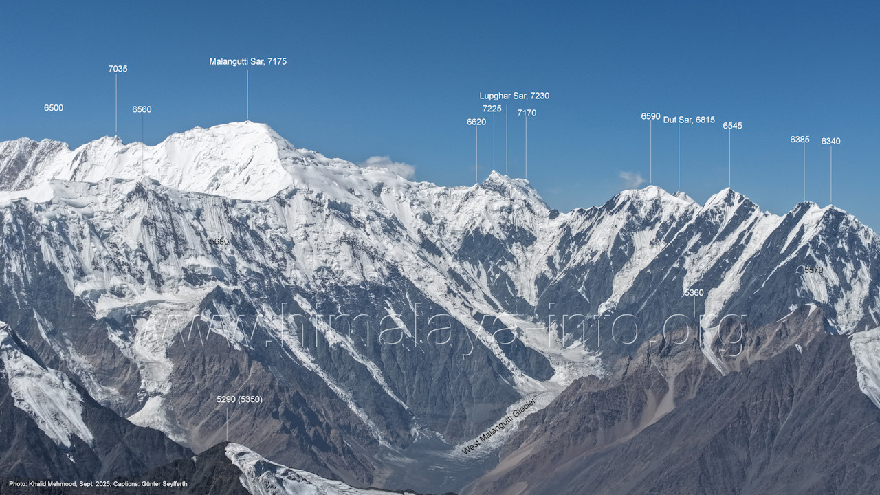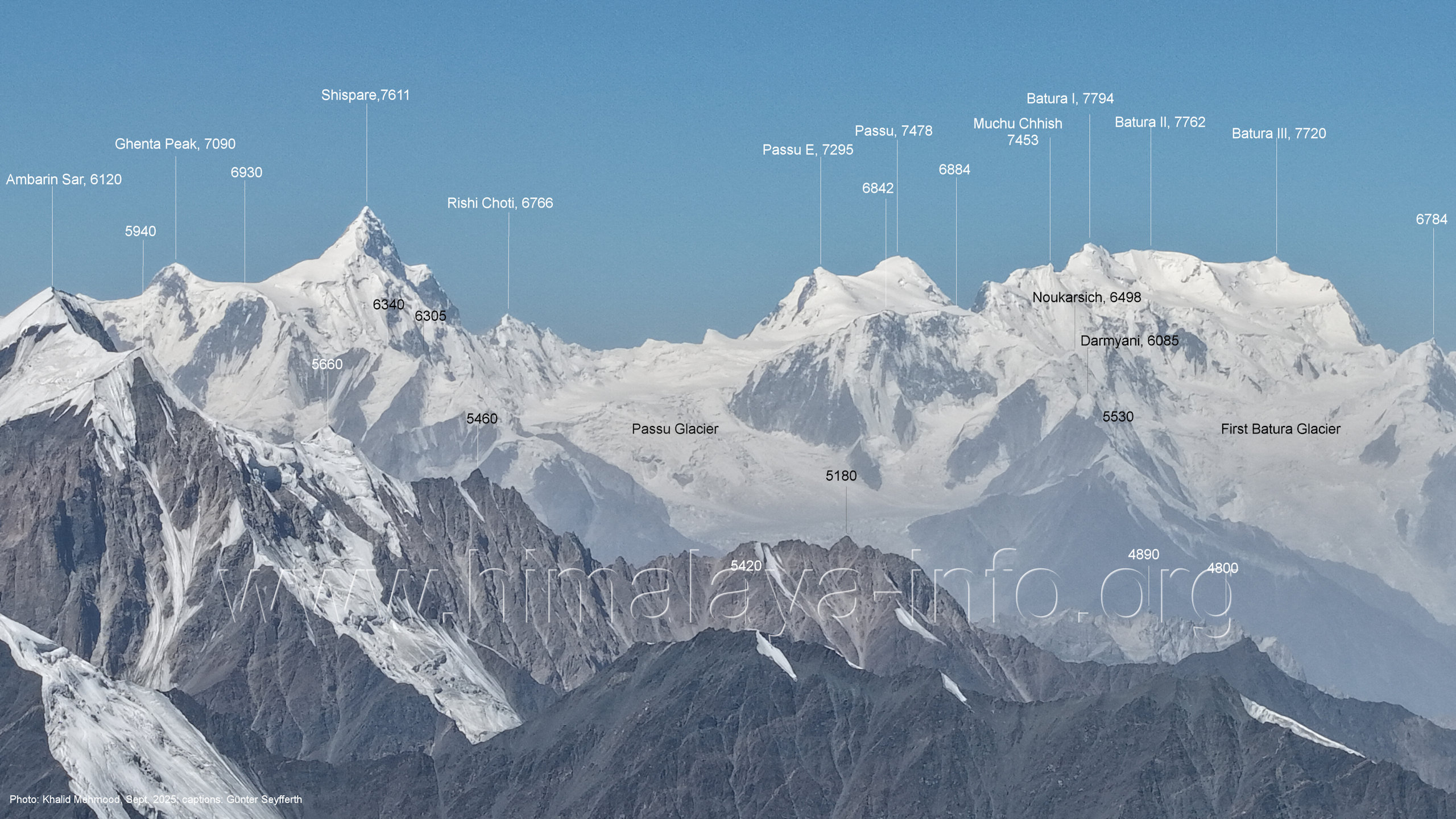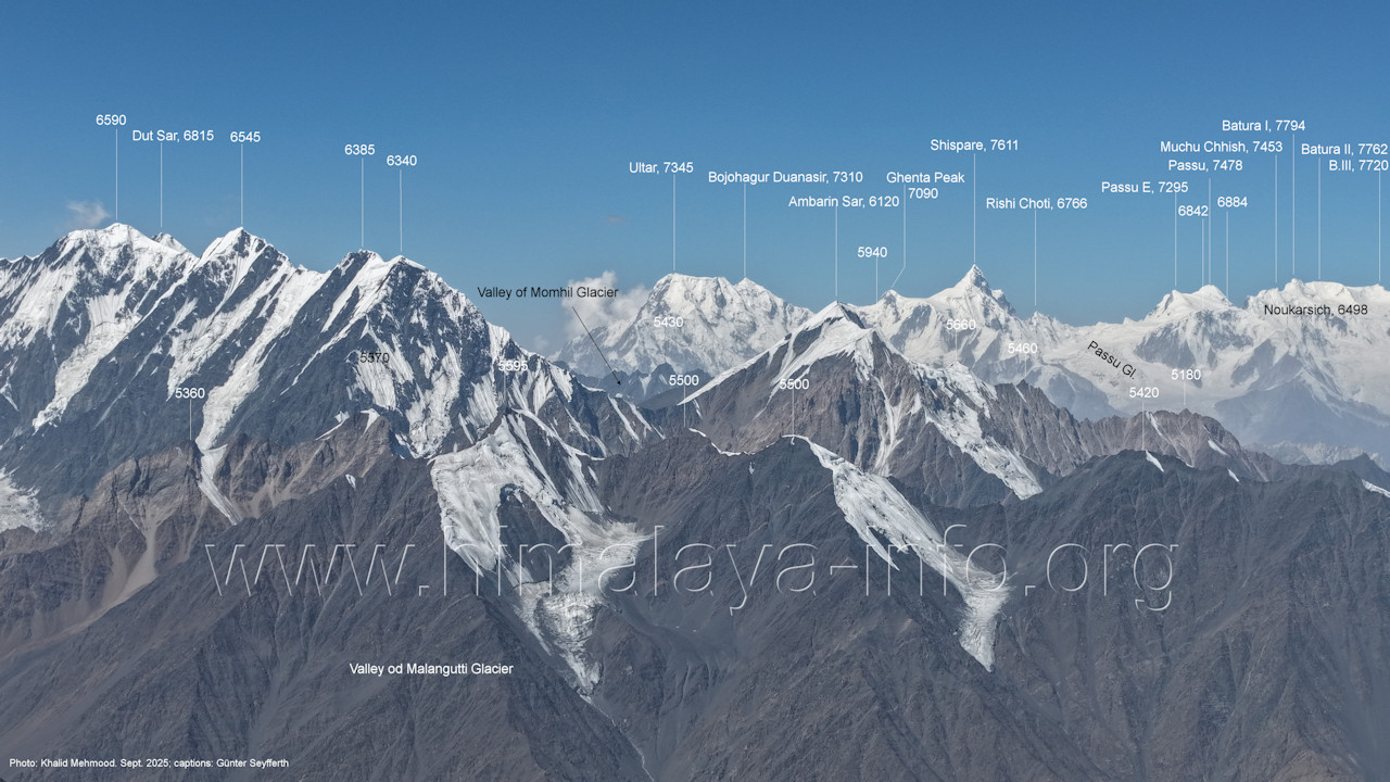 Hispar Muztagh. (4) Blick nach Süd-Südwesten zum Massiv des Disteghil Sar (7885 m) (5) Blick nach Südwesten mit Malangutti Sar (7175 m), Lupghar Sar (7230 m) und Dut Sar (6815 m) Im Vordergrund geht der Blick in das weite Becken des Malangutti-Gletschers. (6) Blick nach West-Südwesten mit Dut Sar (6815 m), Ultar (7345 m), Shispare (7611 m), Passu (7478 m), Muchhu Chhish (7543 m) und Batura I (7794 m) Ziwischen den Bergen des Hispar Muztagh