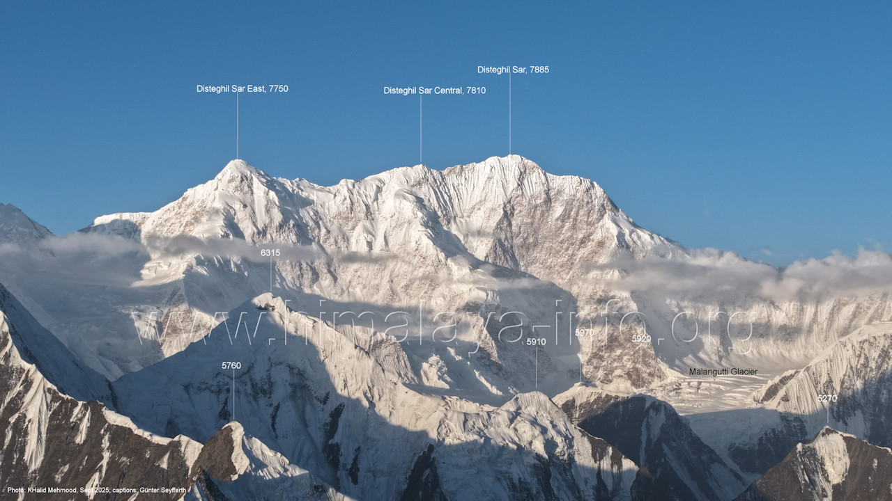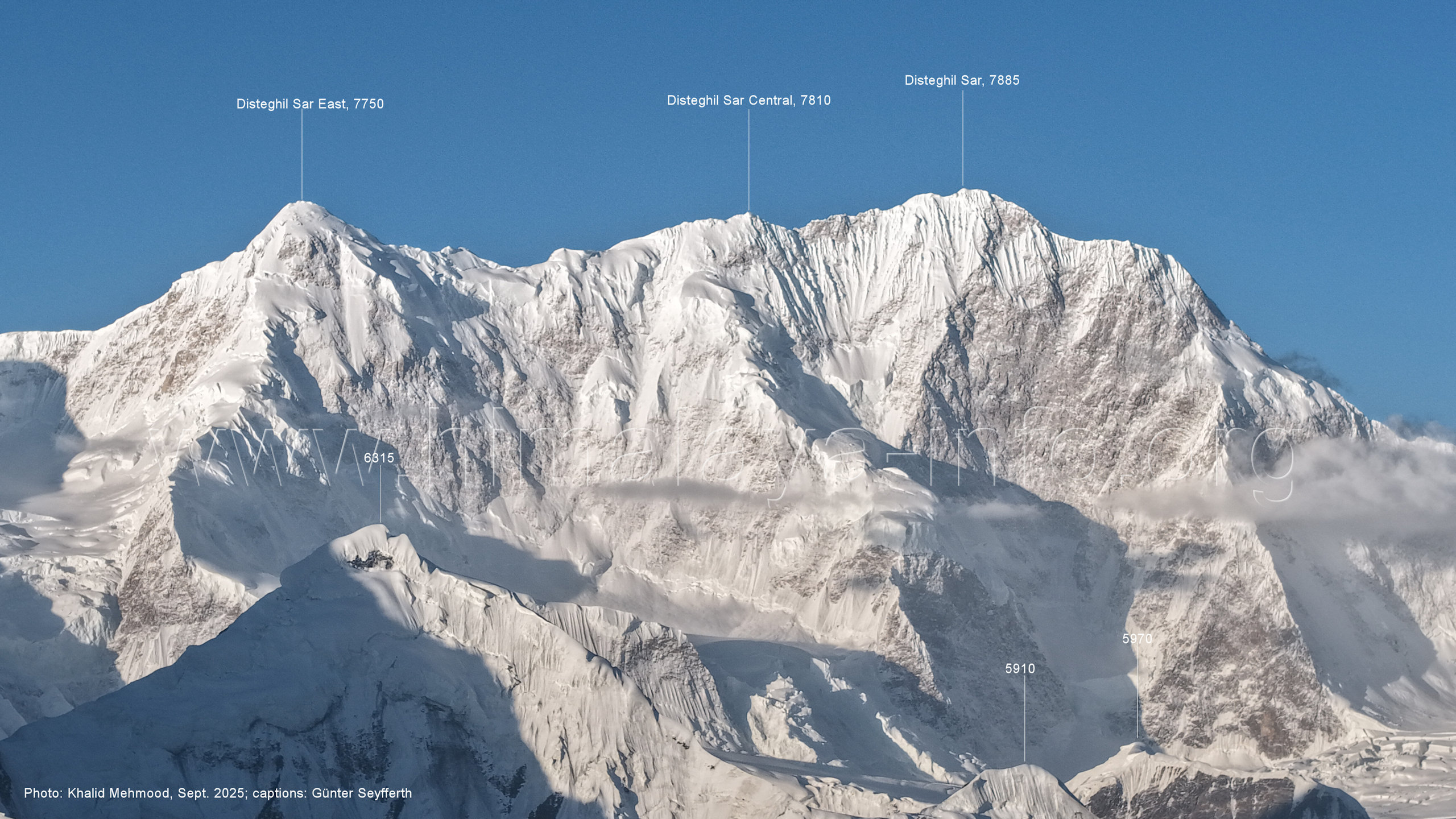 Folgende Links führen zu den Beschreibungen der gezeigten Regionen mit Landkarten: - Karakorum - Shimshal-Region Sued - Karakorum - Shimshal-Region Nord Für alle Bilder dieses Abschnitts gilt: Bildautor: Khalid Mehmood, Beschriftungen: Günter Seyfferth Startpunkt 36°26'17" N, 75°19'06" E am 1. Sept. 2025 in Shimshal (3100 m) Die Bildfolge beginnt mit der Sicht zum Kanjut Sar I und setzt sich jeweils nach rechts fort. (1) Blick nach Süd-Südosten mit Kanjut Sar I (7760 m) und Yukshin Gardan Sar (7495 m) Der Kanjut Sar I ist der östlichste der Siebentausender des Hispar Muztagh. (2) Blick nach Süden zu den beiden Gipfeln des Yazghil Dome (7440 m und 7420 m) und zum Isphardin (6590 m) Die Pioniere der Erkundung des