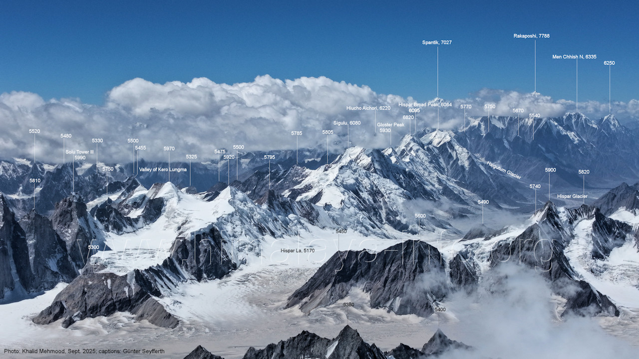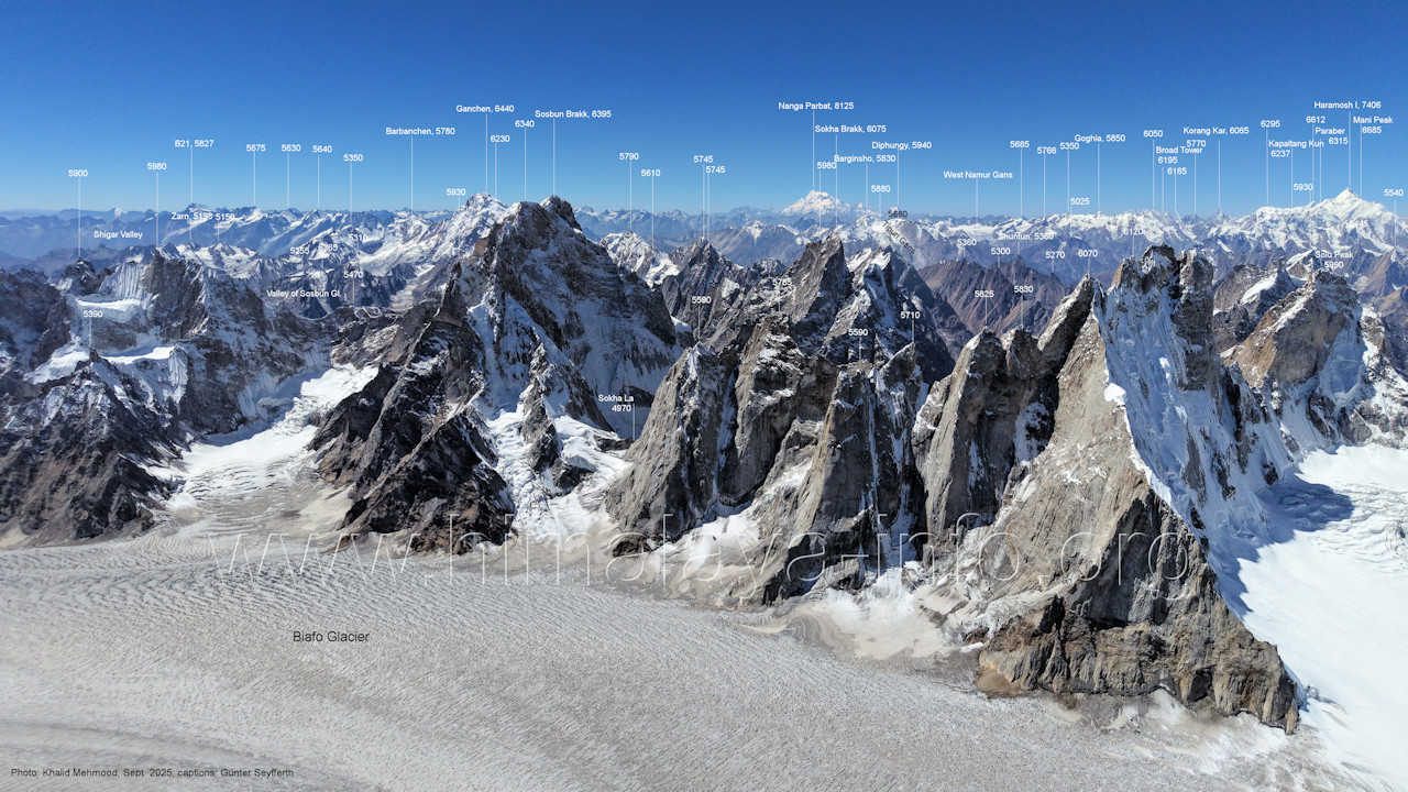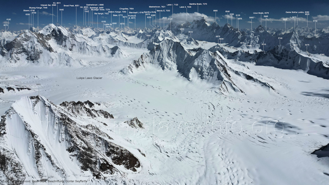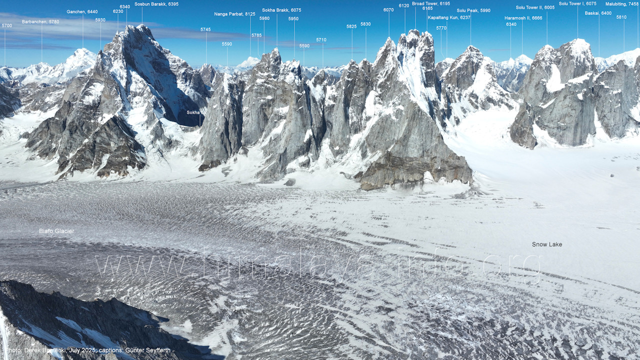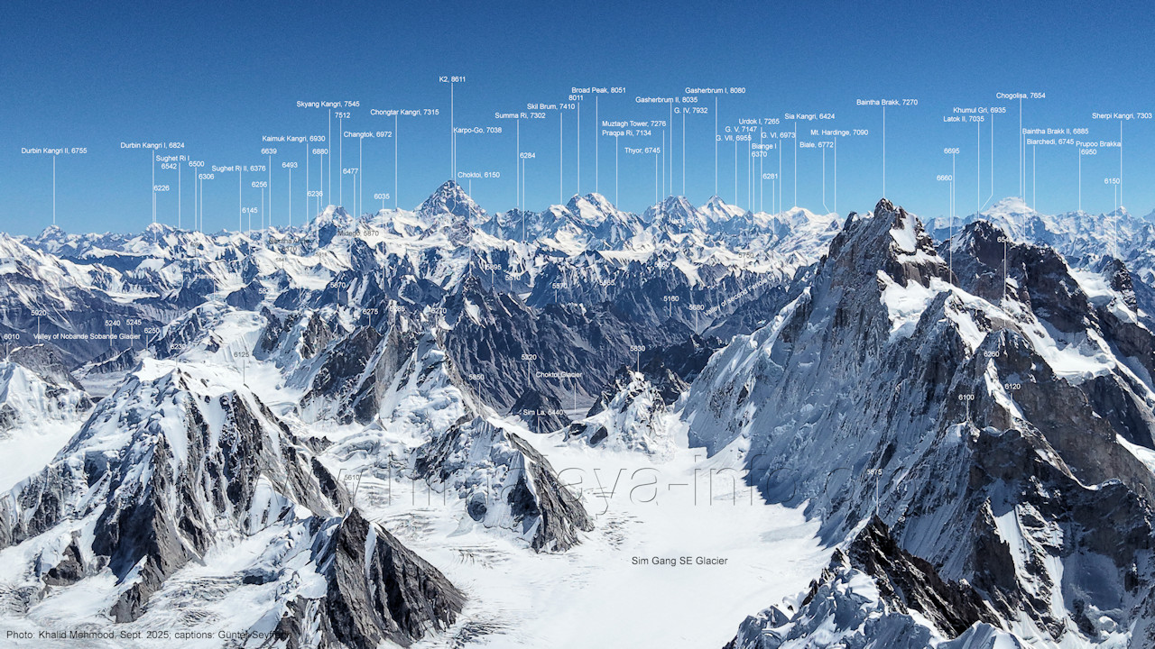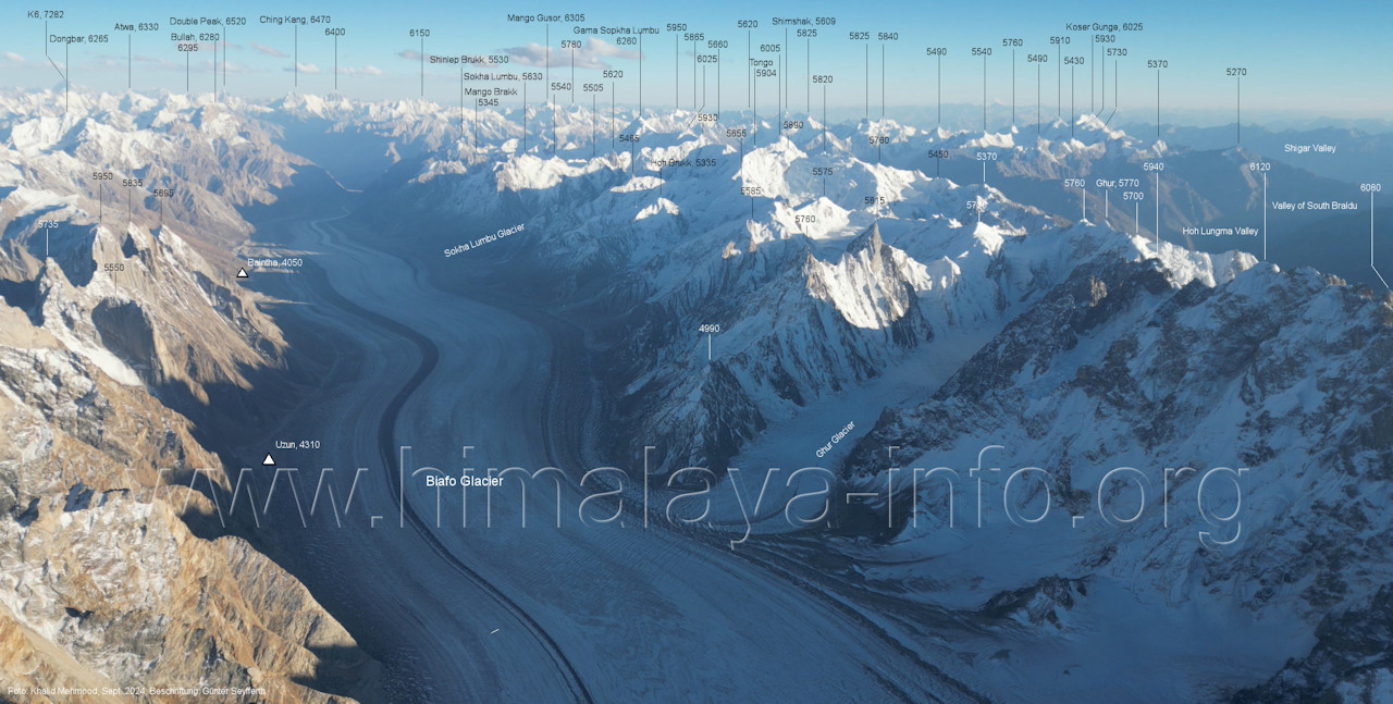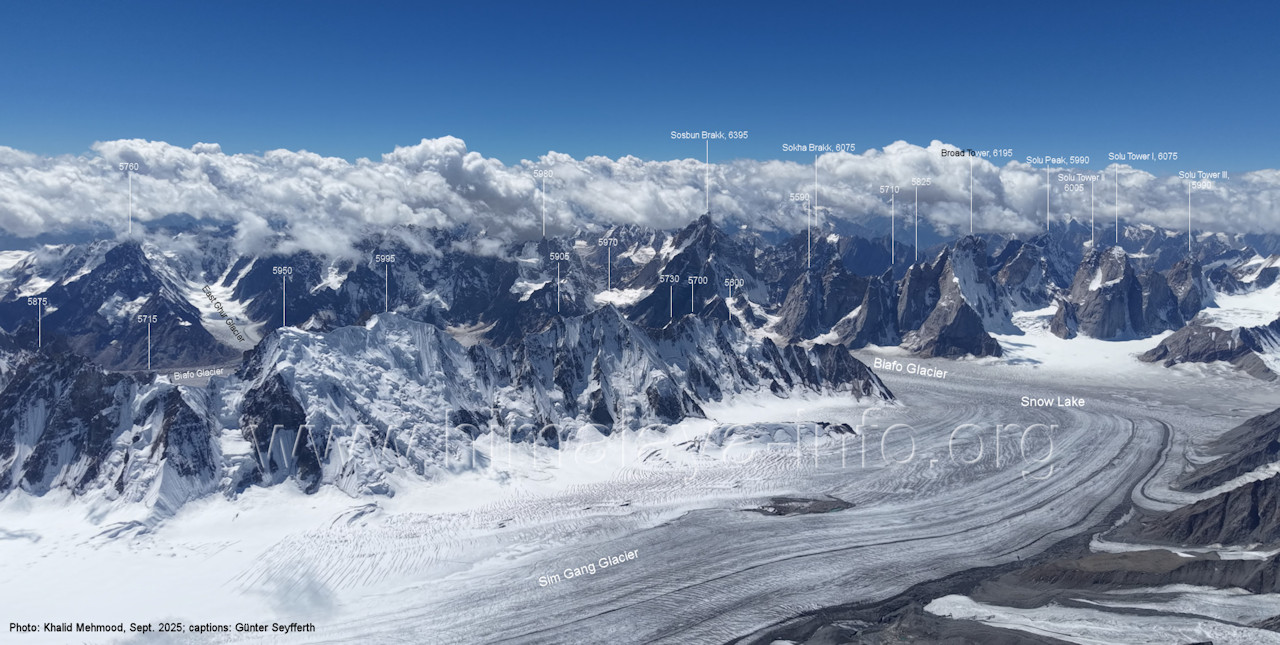 Flughöhe niedriger. (A2-5) Blick nach Südwesten mit Sosbun Brakk (6395 m), Sokha Brakk (6075 m) und Broad Tower (6195 m) Im Hintergrund geht der Blick in den