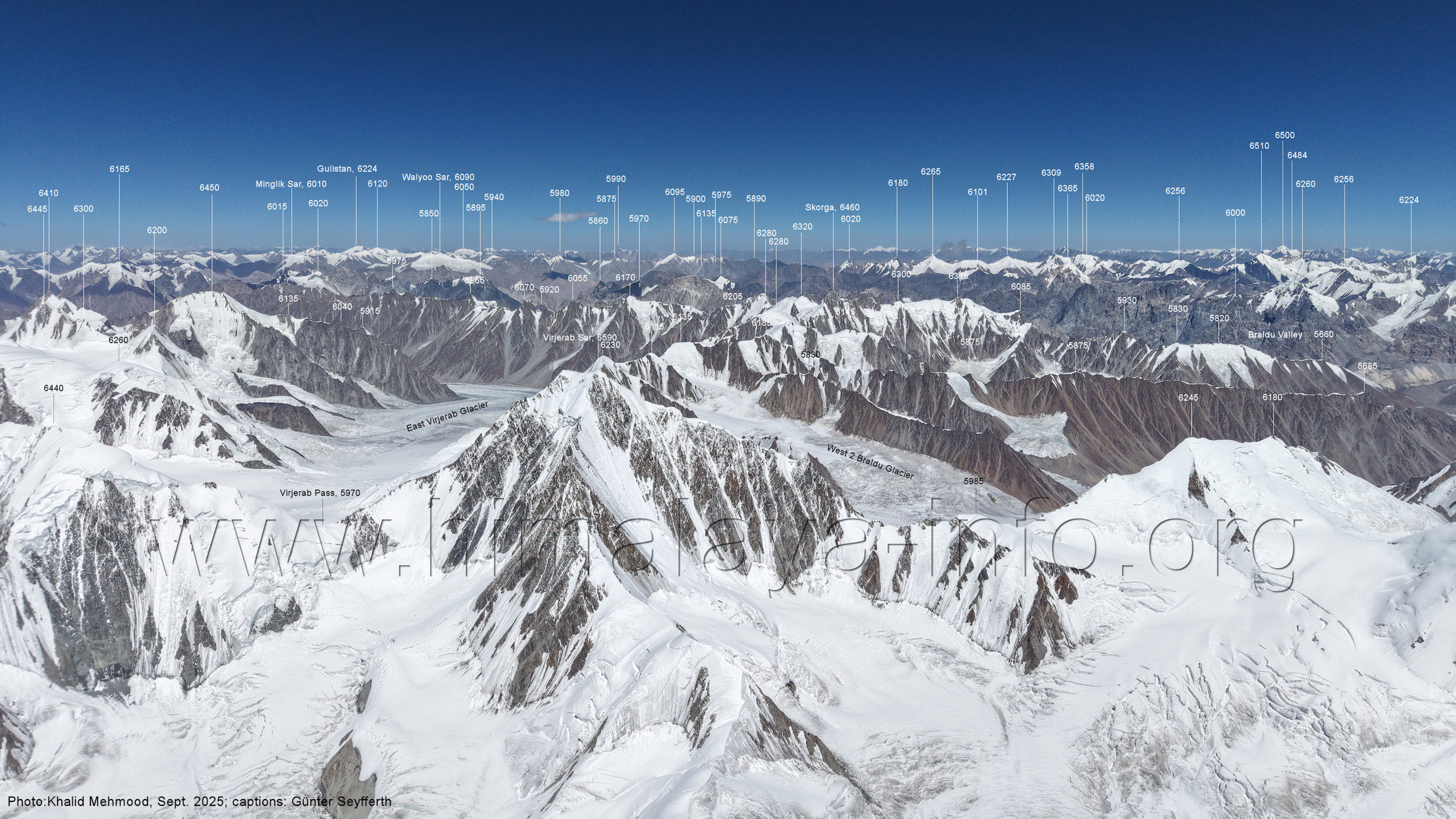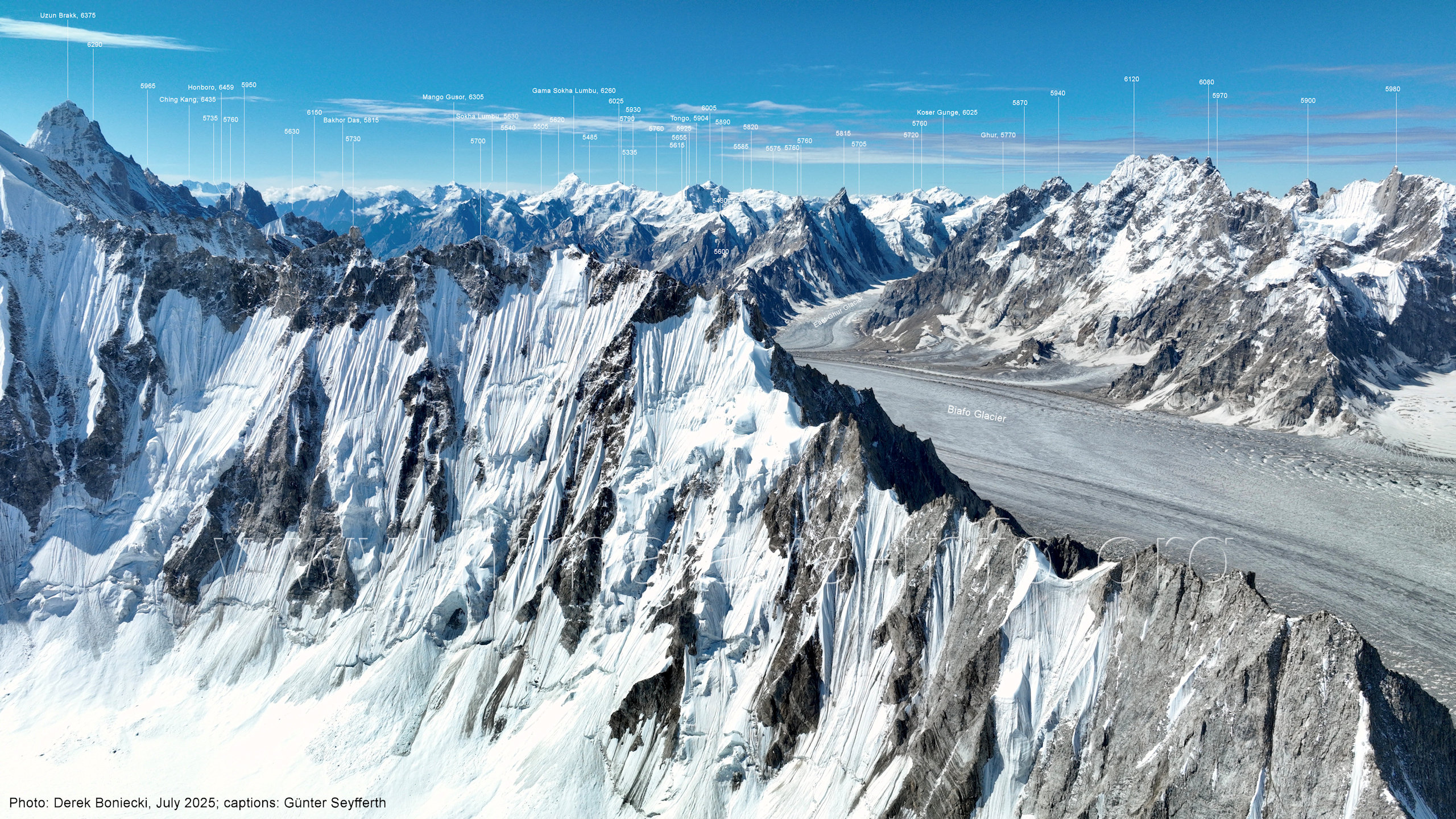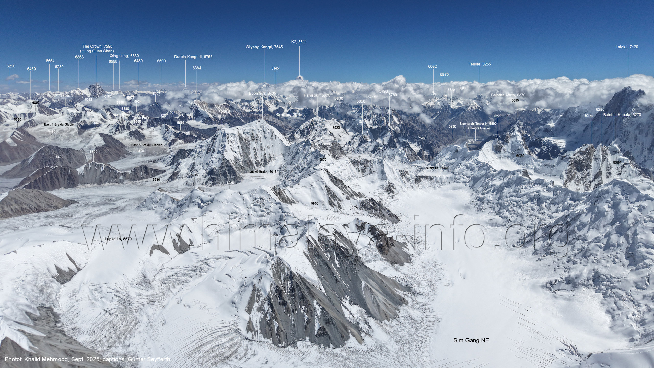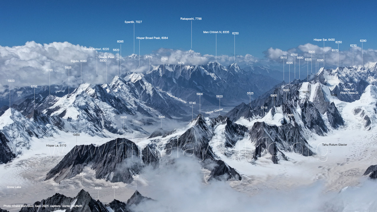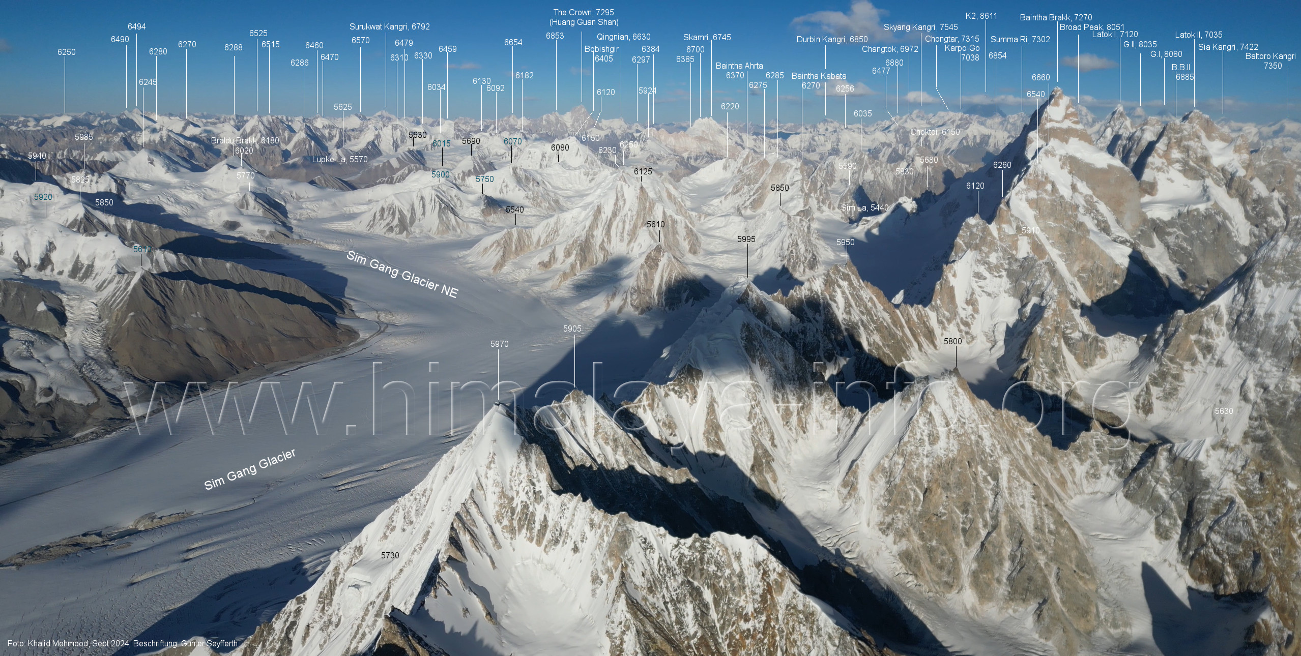 Flughöhe niedriger. (A2-5) Blick nach Südwesten mit Sosbun Brakk (6395 m), Sokha Brakk (6075 m) und Broad Tower (6195 m) Im Hintergrund geht der Blick in den