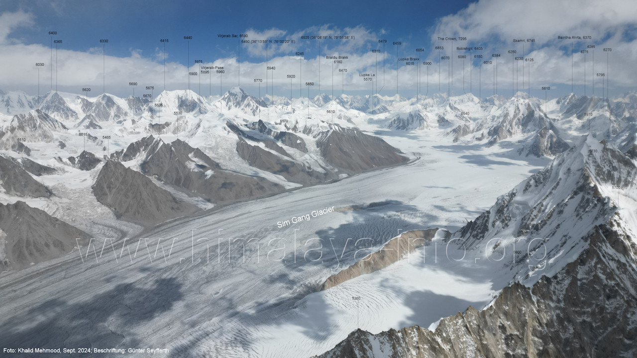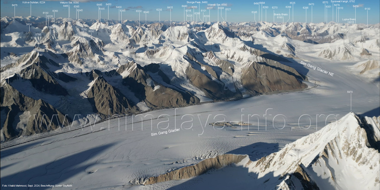 südöstlichen SimGang-Gletscher Der Flug erfolgte im Bereich zwischen Peak 5850 und Peak 6660, also etwas östlich vom Flug gemäß des vorstehenden Abschnitts. Für alle Bilder dieses Unterabschnitts gilt: Foto: Khalid Mehmood, Beschriftung: Günter Seyfferth (B2-1) Blick nach Ost-Südosten zum Sim La (5440 m)