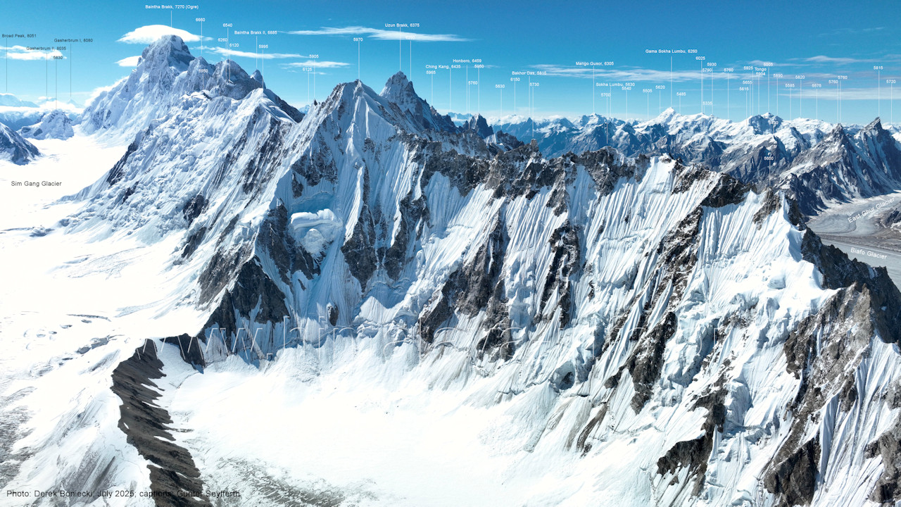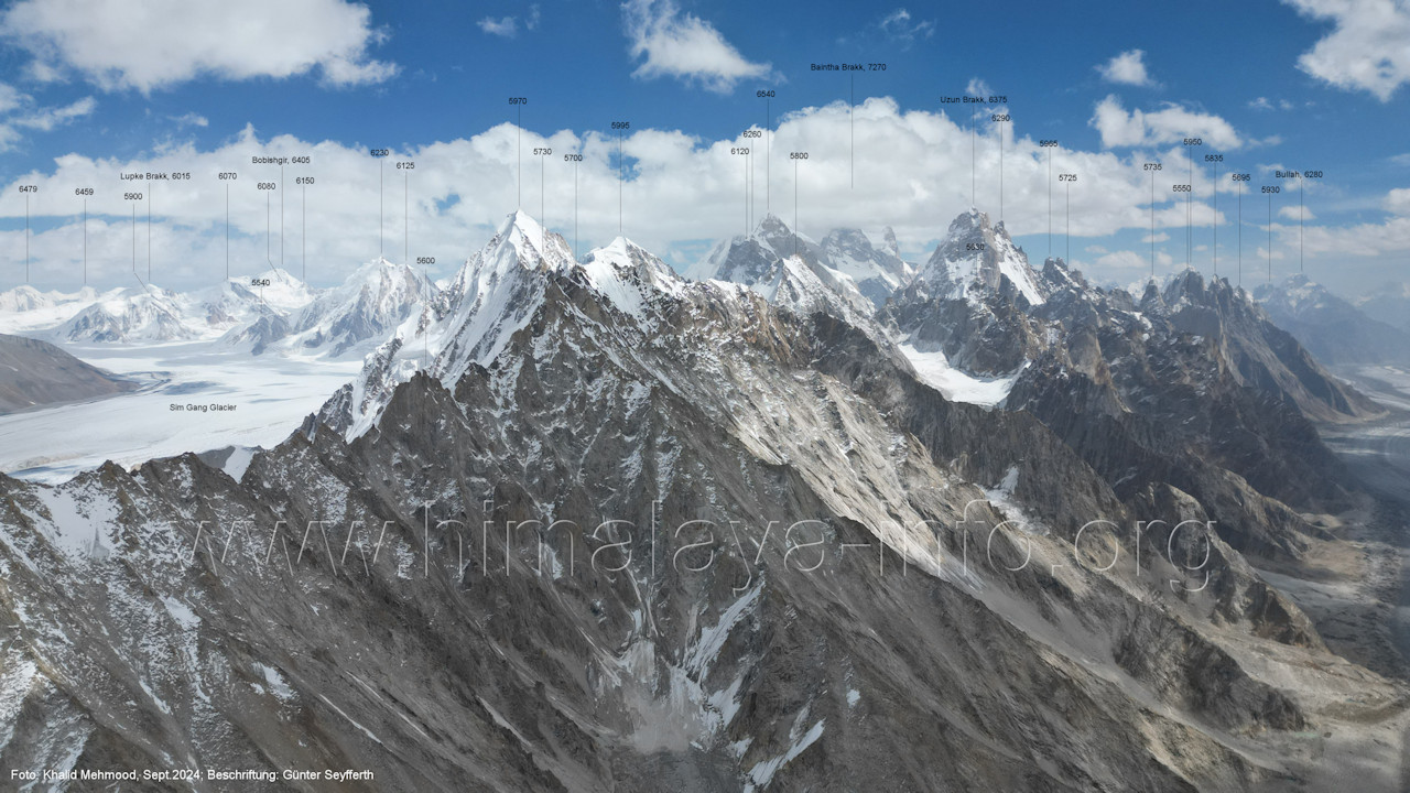 II (7035 m), Baintha Brakk (7270 m) Die Nordwand des Bainthe Brakk ist noch unbezwungen (Stand 2025), die Nordwände der unbenannten Gipfel ohnehin. (B4-12) Blick nach Südwesten zum Sim Gang-Gletscher und zu den Gipfeln beidseits des oberen Biafo-Gletschers