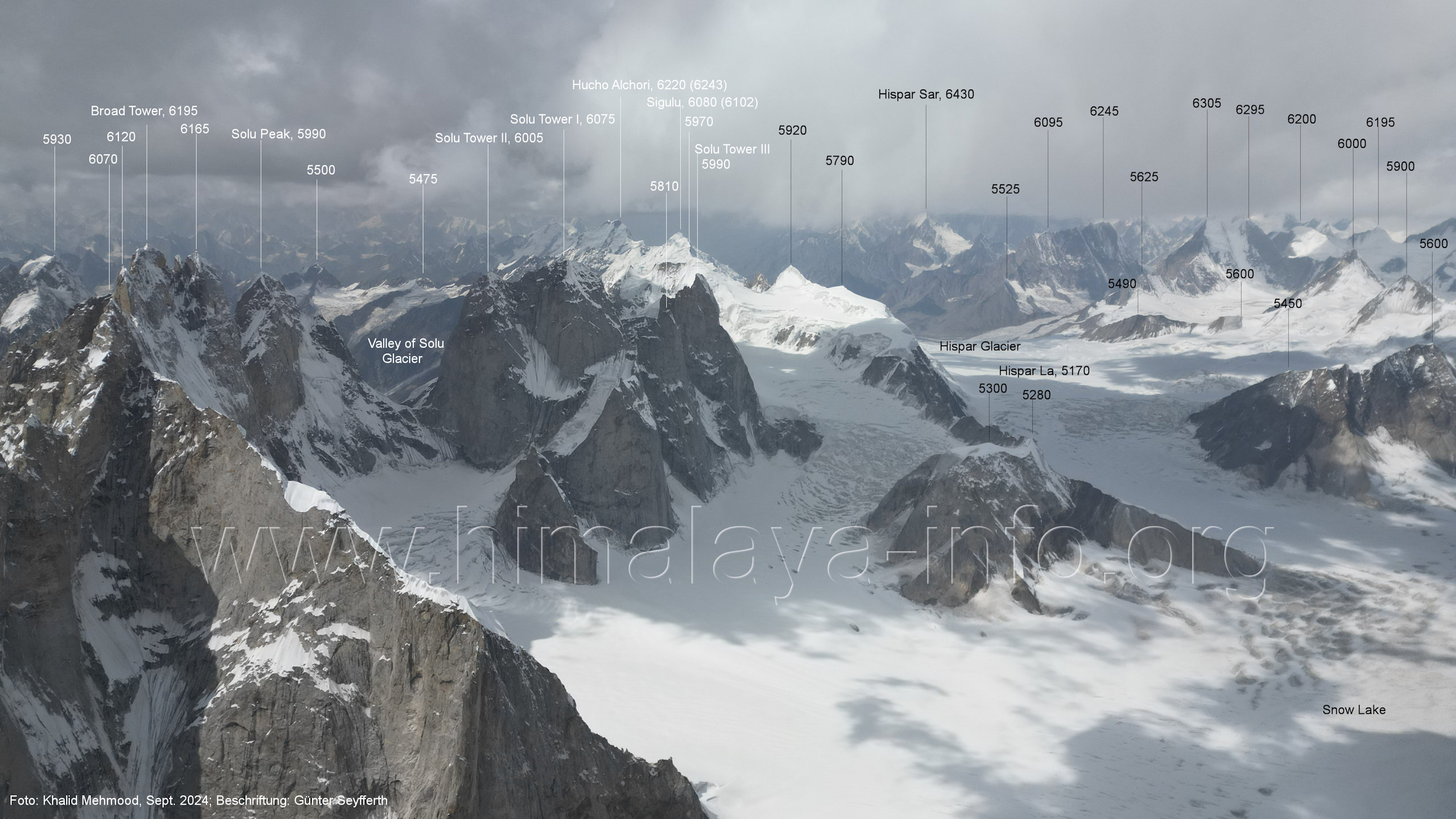 Blick nach Westen zu den Gipfeln beidseits des oberen Hispar-Gletschers Der rechts sichtbare Tahu Rutum-Gletscher ist der nordwestliche Arm des Snow Lake. (B4-16) Blick nach Westen zum Bereich der Gipfel um den Tahu Rutum-Gletscher im Nordwesten des Snow Lake Der Tahu Rutum (6675 m) und die Peaks 6160 und 6305 markieren das östliche Ende des Hispar Muztagh und das westliche Ende des Snow Lake.