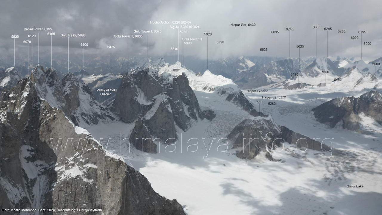 Sokha-Gletschers. (A2-6) Blick nach Westen zum Bereich des Hispar La (5170 m) Ganz links sieht man nochmals den Broad Tower; nach rechts folgen die Solu Towers. A3 -