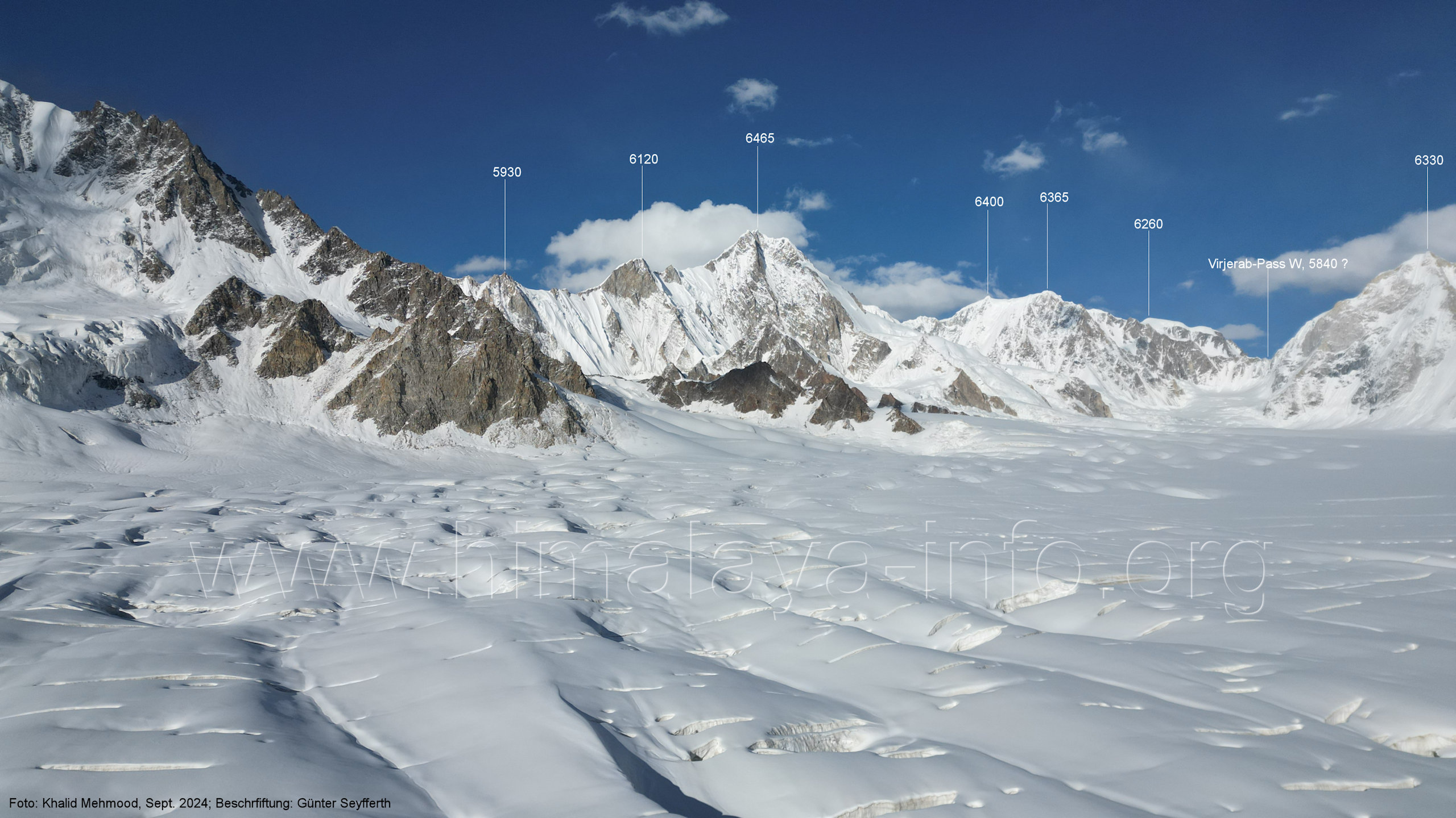 Virjerab-Pass Der Startpunkt liegt knapp unterhalb des Virjerab-Passes. Für alle Bilder dieses Unterabschnitts gilt: Foto: Khalid Mehmood, Beschriftung: Günter Seyfferth Die Bildfolge beginn mit dem Blick nach Südwesten uns setzt sich nach rechts fort, also im Uhrzeigersinn. (B5-1) Blick nach Südwesten in den mittelren und südwestlichen teil des Snow Lake