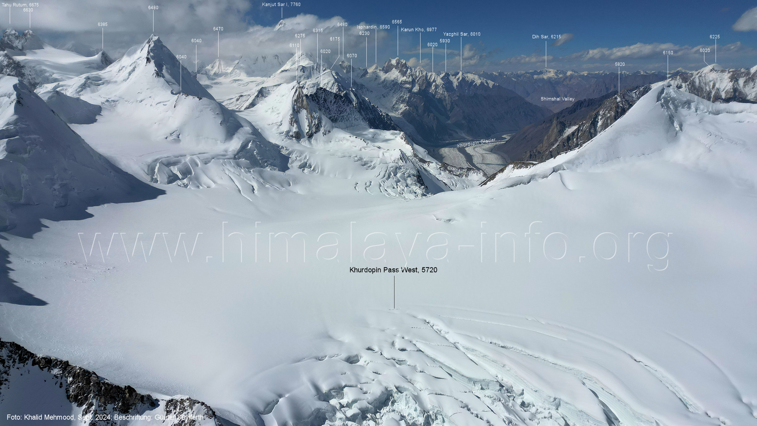nach dem Start in der Regel natürlich ihre Positionen Für alle Bilder dieses Unterabschnitts gilt: Foto: Khalid Mehmood, Beschriftung: Günter Seyfferth Die Bildfolge beginnt mit der Sicht nach Nordwesten und setzt sich jeweils nach rechts fort. (A6-1) Blick nach Nord-Nordwesten zum Khurdopin-Pass West (5720 m) Vom