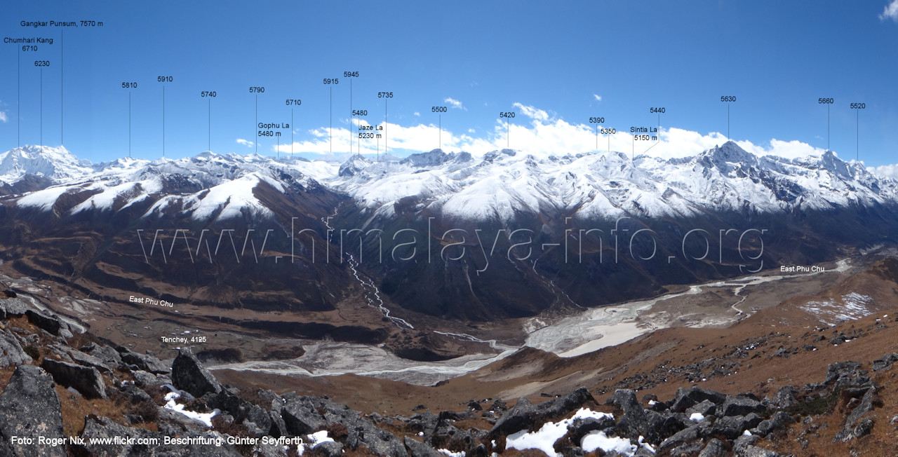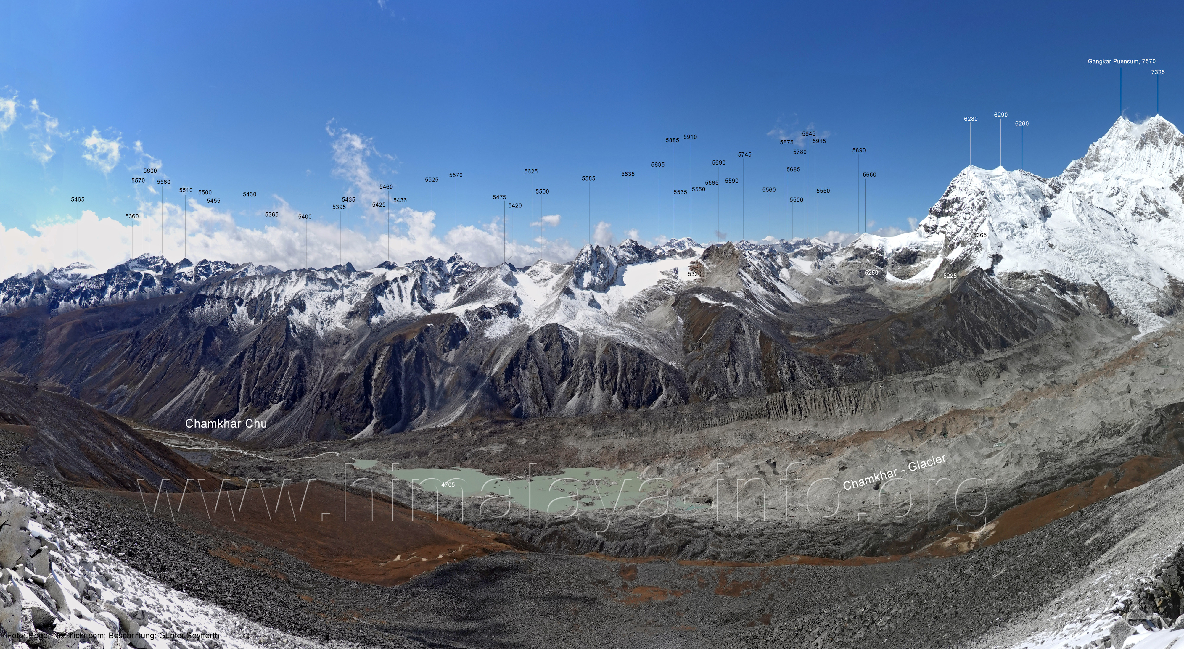 Blick nach Süden vom Gangkar Puensum (7570 m, links) bis zum Kangphu Kang II