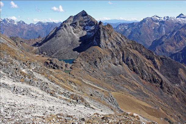 Rückblick nach West-Südwesten mit Kangphu Kang I (7204 m), Teri Kang (7130 m)