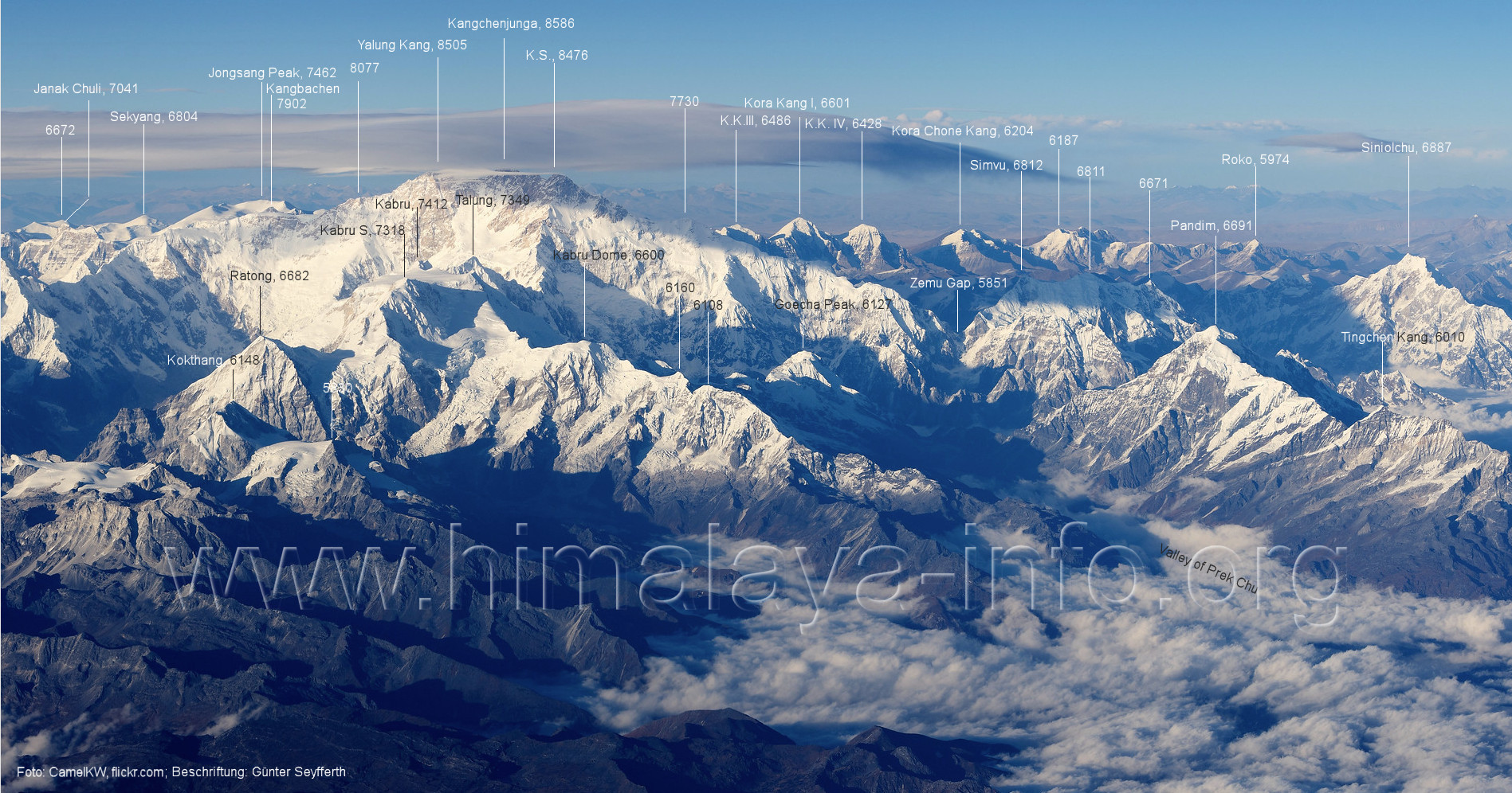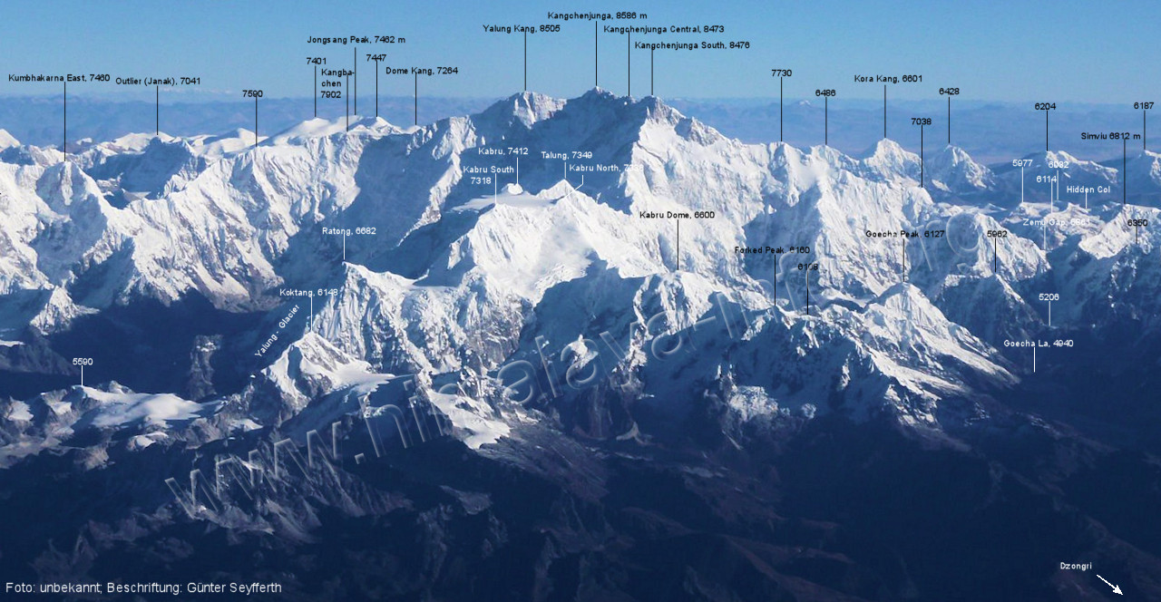 sehen. Foto: CamelKW; Beschriftung: Günter Seyfferth Etwas mehr von der rechten Bildhälfte des vorstehenden Fotos enthüllt das folgende Luftbild: (7) Luftbild der westlichen Gipfel Sikkims von Süden