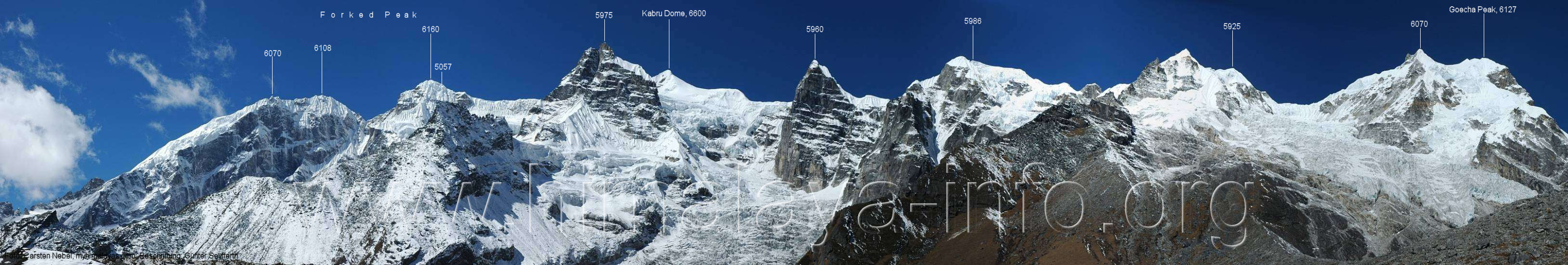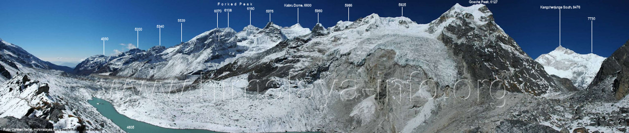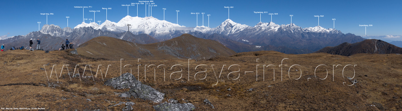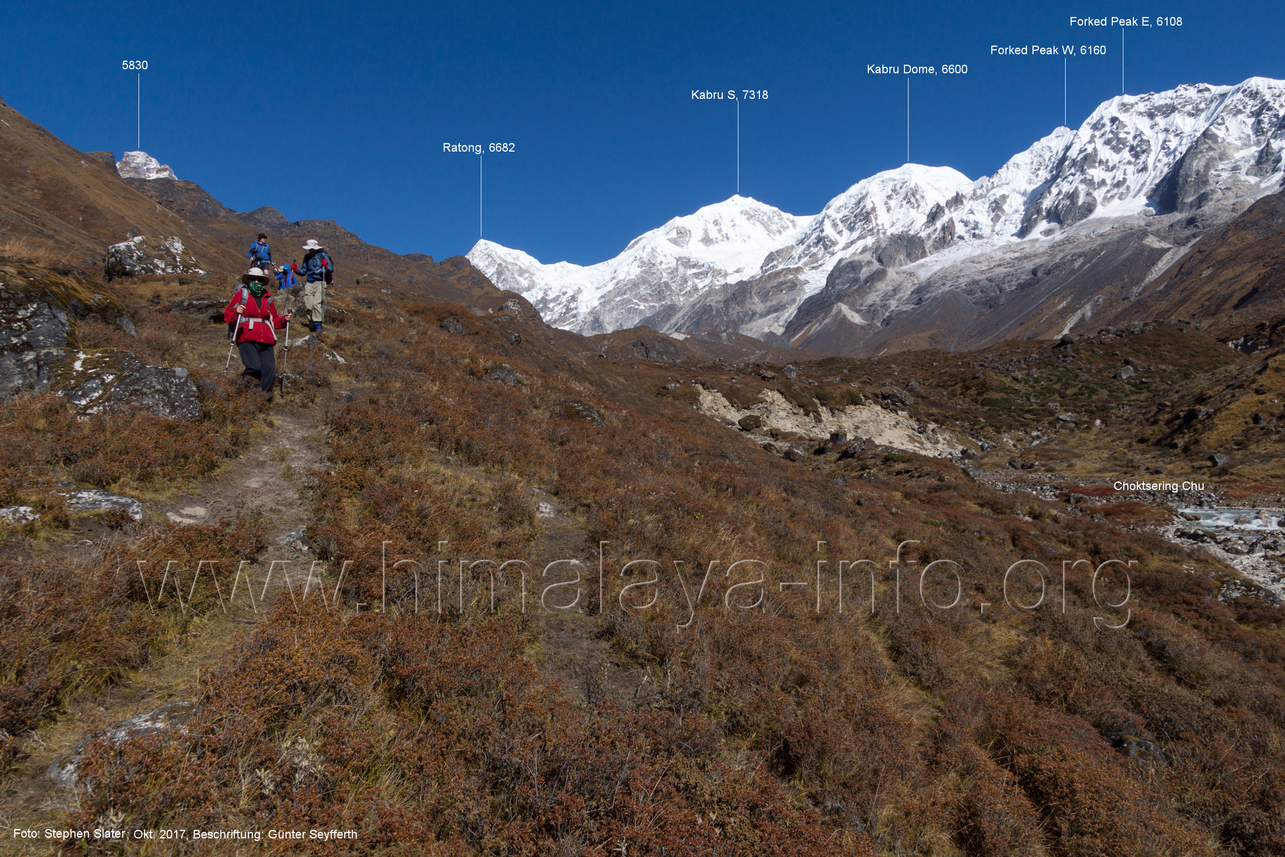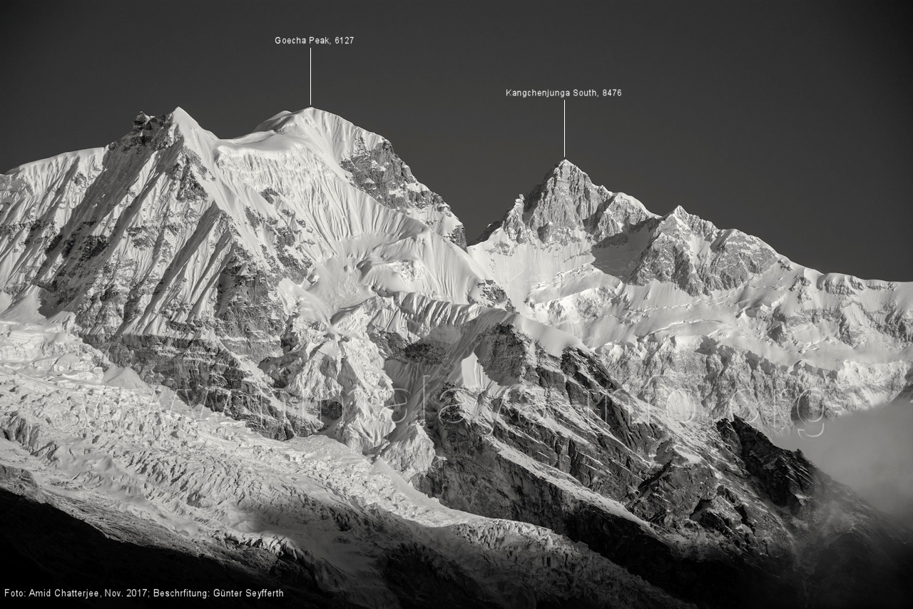 Aufstieg zur Alm Panding. Die Hochalm Panding ist nochmals ein hervorragender Aussichtspunkt auf dem Weg zum Goecha La. Man wird dort übernachten. Foto: phkkr, Nov. 2018; Beschriftung: Günter Seyfferth (24) Blick vom Kokling-Pass (4254 m) nach Nordosten zum Pandim (6691 m) Der nach links abfallende Grat endet am Goecha La. Foto: phkkr, Nov. 2018; Beschriftung: Günter Seyfferth (25) Blick von der Hochalm Panding (ca. 4150 m) nach Nord-Nordwesten zum Kokthang (6148 m) und Ratong (6682 m) Foto: Stephen Slater, Okt. 2017; Beschriftung: Günter Seyfferth Das folgende Bild schließt rechts an: