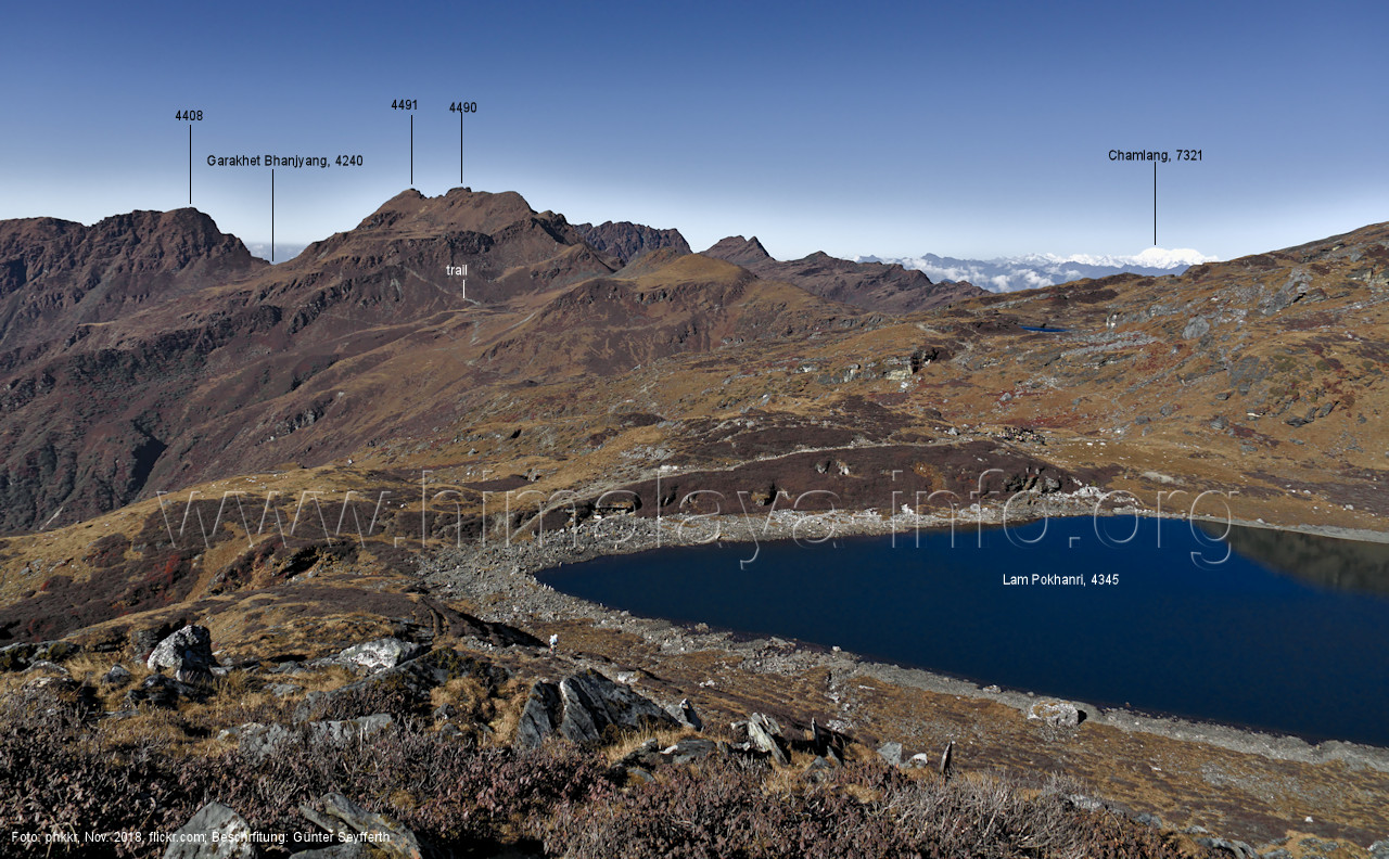 Tal. Foto: kogo59, Nov. 2009; Beschriftung: Günter Seyfferth (181) Blick aus ca. 4350 m Höhe im Aufstieg zum Sinelapche La zu den Gipfeln des Kangchenjunga (8586 m) Die Berge vor dem Kangchenjunga stehen unmittelbar über der Alm Ramche (4520 m). Foto: kogo59, Nov. 2009; Beschriftung: Günter Seyfferth (182) Blick vom Bergsee in 4450 m Höhe zum weiteren Aufstieg zum Sinelapche La Rechts oben erkennt man den Pfad. Foto: kogo59, Nov. 2009; Beschriftung: Günter Seyfferth