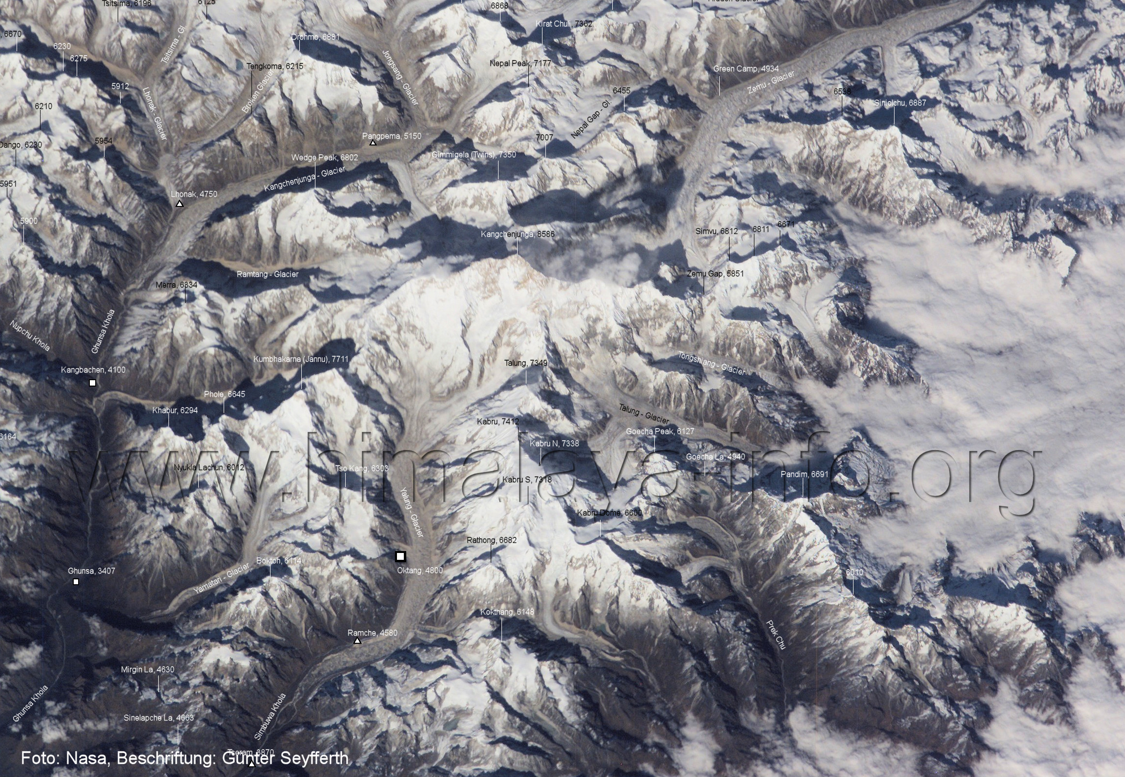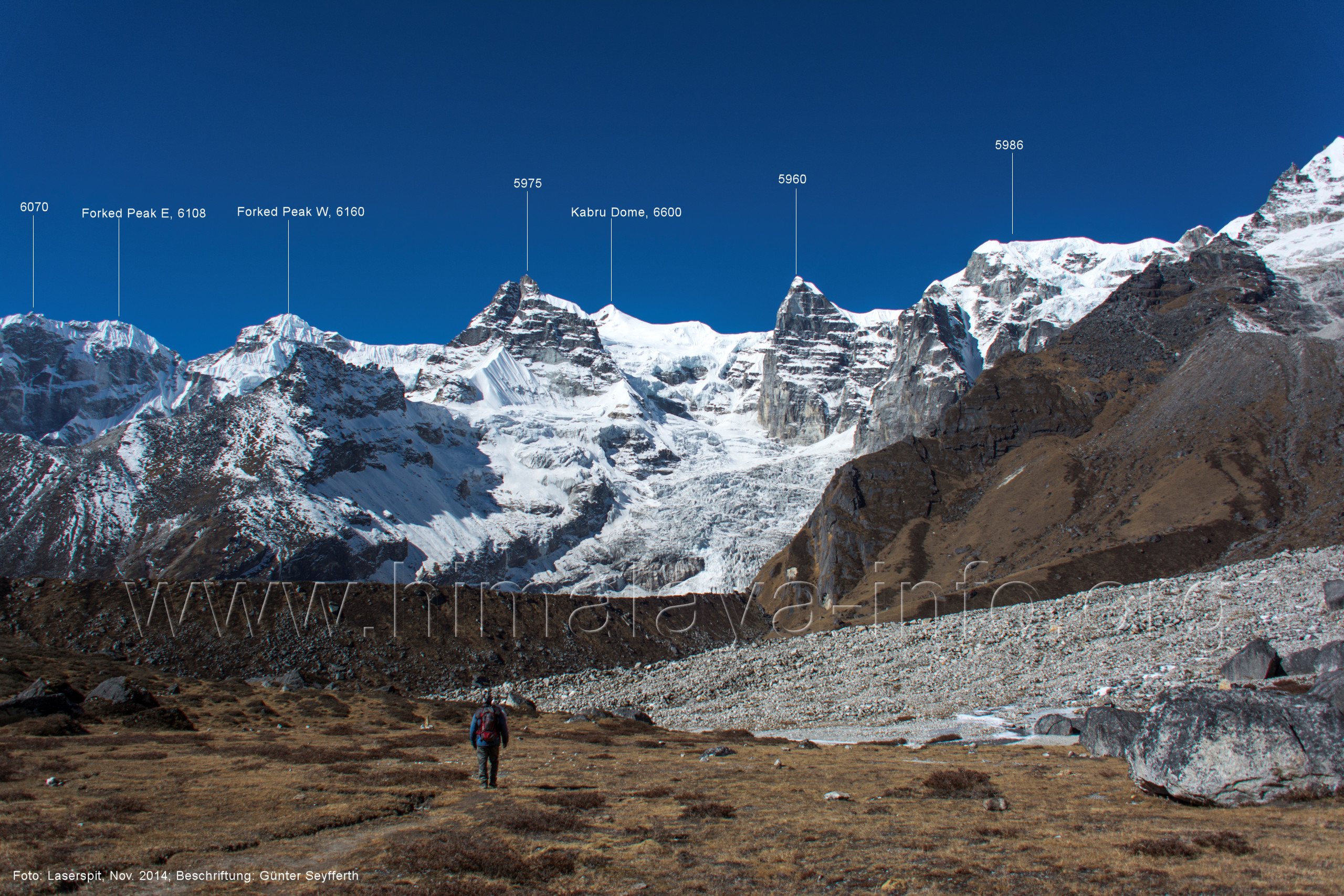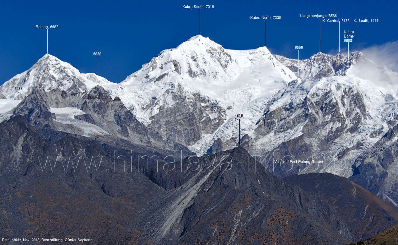 voller Höhe vom Fuß bis zum Gipfel. Foto: Stephen Slater, Okt. 2017; Beschriftung: Günter Seyfferth (39) Blick vom Choktsering-Pass (4550 m) nach Nordwesten ins Tal des Ost-Ratong-Gletschers Am rechten Bildrand sind die Gebäude des Himalayan Mountaineering Institute (HMI) unter der Stirnmoräne des East Ratong-Gletschers markiert. Foto: phkkr, Nov. 2018; Beschriftung: Günter Seyfferth (40) Blick vom Choktsering-Pass nach Süd-Südosten Von rechts ist man aus dem unbenannten Tal herauf