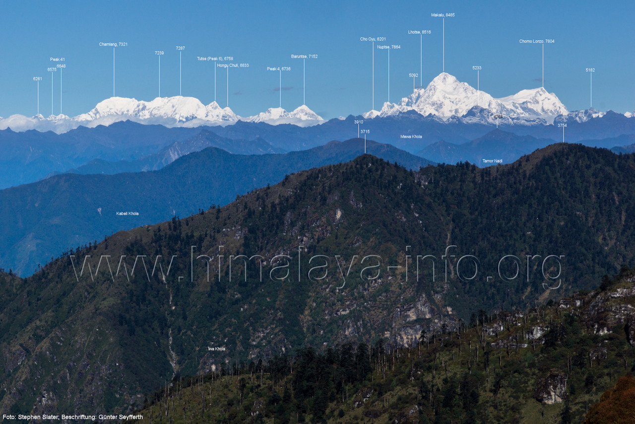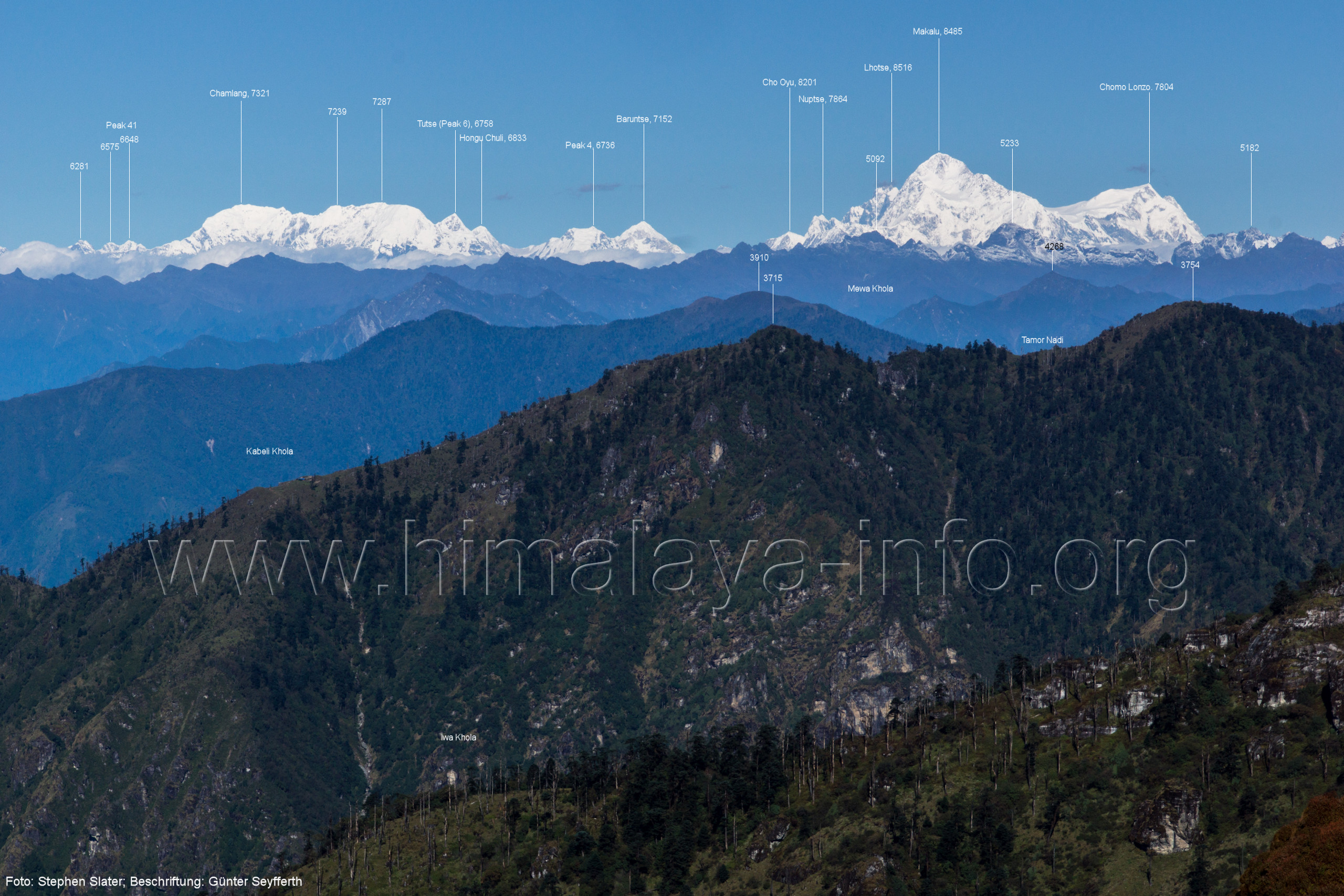 Westen Man beachte, dass der Blick bis zum Mount Everest reicht, ca. 118 km entfernt. Foto: Oleg Bartunov, Okt. 2024; Beschriftung: Günter Seyfferth Das folgende Bild wurde aus derselben Position aufgenommen: