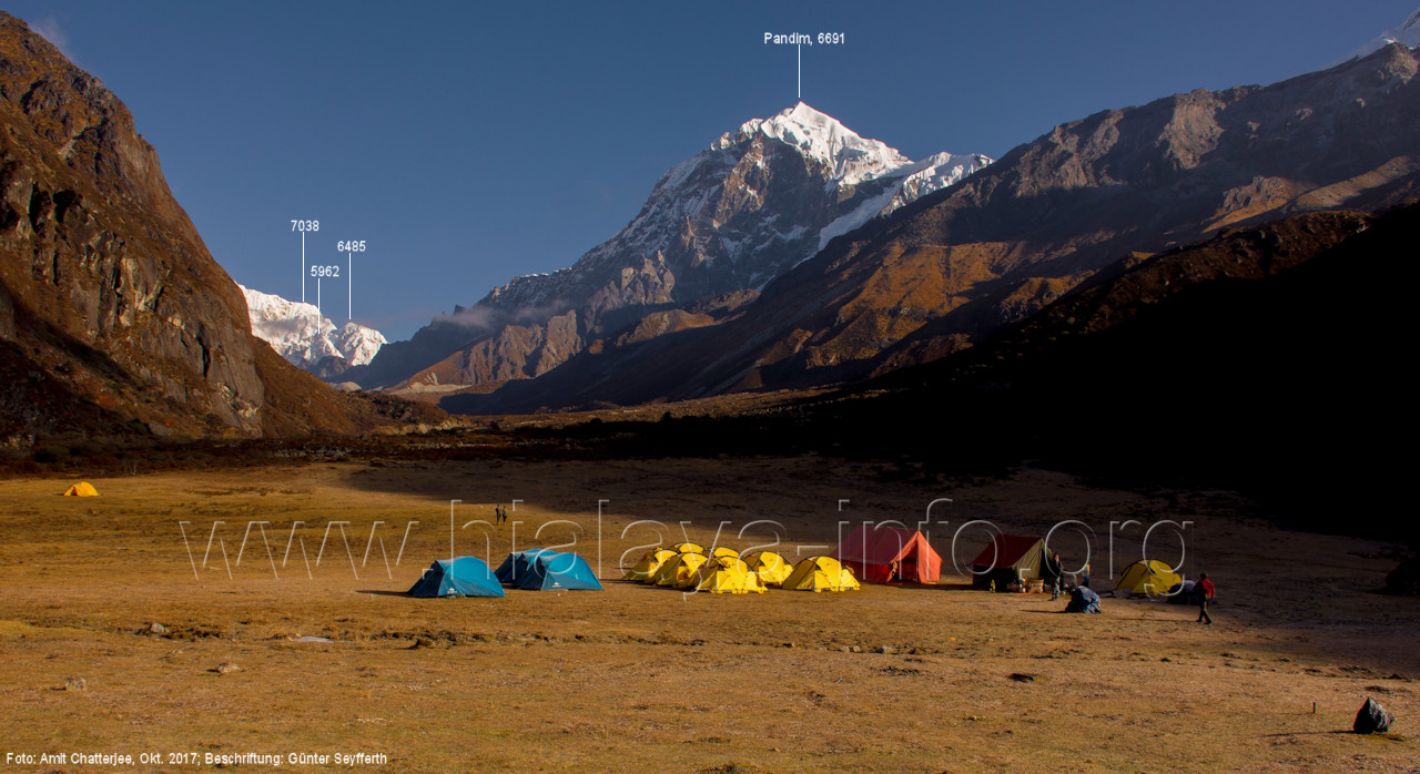 zum Pandim (6691 m) und Tingchenkang (6010 m) In dieser Höhe wachsen noch Bäume, bald aber hört die Bewaldung auf. Foto: Bental_3000, Nov. 2010; Beschriftung: Günter Seyfferth (56) Blick vom Lagerplatz Tangshing in ca. 3950 m Höhe nach Norden zum Pandim (6691 m) Foto: Amit Chatterjee, Okt. 2017; Beschriftung: Günter Seyfferth (57) Tele-Blick vom Lagerplatz Tangshing (3950 m) nach Norden zum Nordwestgrat des Pandim Foto: Amit Chatterjee, Okt. 2017; Beschriftung: Günter Seyfferth (58) Blick vom Lagerplatz Tangshing nach Osten zum Tingchenkang (6010 m) und Jopuno (5936 m) Foto: Amit Chatterjee, Okt. 2017; Beschriftung: Günter Seyfferth (59) Blick vom Lagerplatz Lamoi in 4080 m Höhe nach Norden zum Kangchenjunga (8586 m), Goecha Peak (6127 m) und Pandim (6691 m)