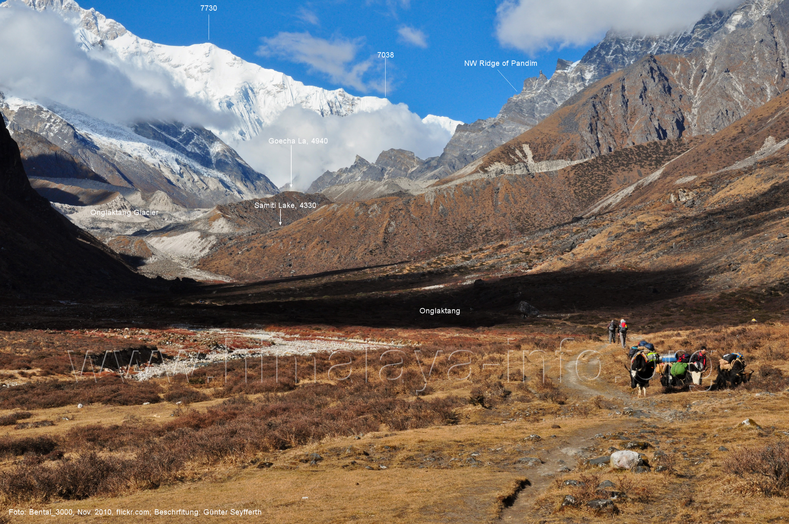 Dzongri ist eine weite Almfläche in 4020 bis 4500 m Höhe. (46) Blick von Dzongri nach Nord-Nordwesten zum Kokthang (6148 m) und Ratong (6682 m) Foto: Massimo Beltrame, Sept. 2010; flickr.com; Beschriftung: Günter Seyfferth (47) Blick von Dzongri nach Nord-Nordwesten zum Ratong (6682 m), Kabru S (7318 n) und Peak 4810 Foto: unbekannt, Mai 2007; Beschriftung: Günter Seyfferth