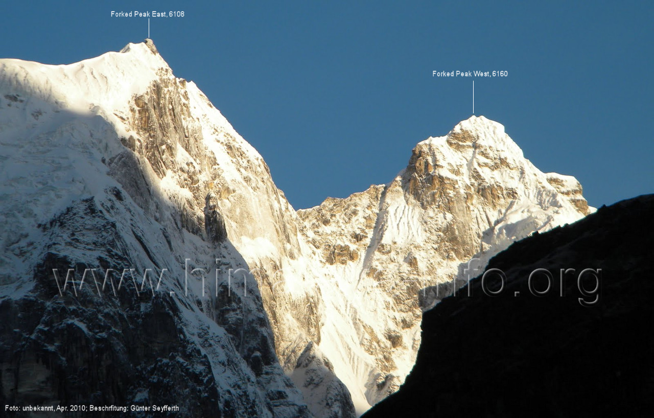 Forked Peak (6160/6108 m), Rechts der Bildmitte ist der nächste Rastplatz Tangshing in 3950 m Höhe im Talgrund des Prek Chu markiert. Foto: Bental_3000, Nov. 2010; Beschriftung: Günter Seyfferth (52) Blick von Dzongri nach Nordosten zum Pandim (6691 m), Tingchenkang (6010 m) und Jopuno (5936 m) Auch hier ist der Rastplatz Tangshing markiert, Foto; unbekannt, Mai 2008, Beschriftung: Günter Seyfferth (53) Blick von Dzongri nach Nordosten zum Pandim (6691 m) Bitte vergleichen Sie mit Bild Nr. 24. Foto: unbekannt, Sept. 2010 (54) Blick von Dzongri nach Ost-Nordosten zu Gipfeln südlich des Jopuno