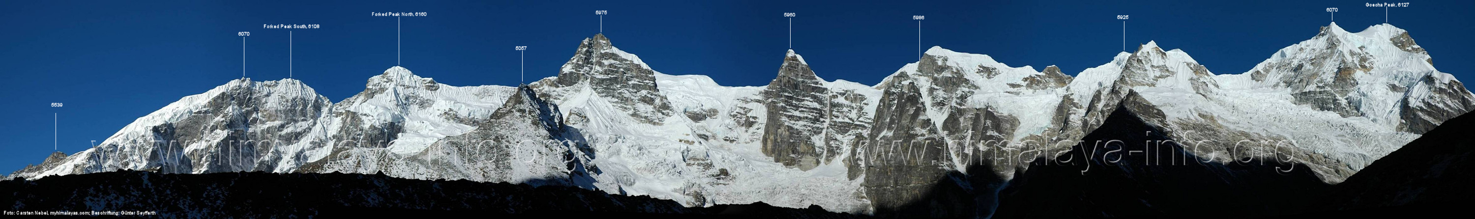 Fotos wurden von verschiedenen dortigen Standorten aufgenommen. (15) Panorama-Blick vom Danphebir-Pass (4535 m) nach Nord-Nordwesten bis Ost-Nordosten